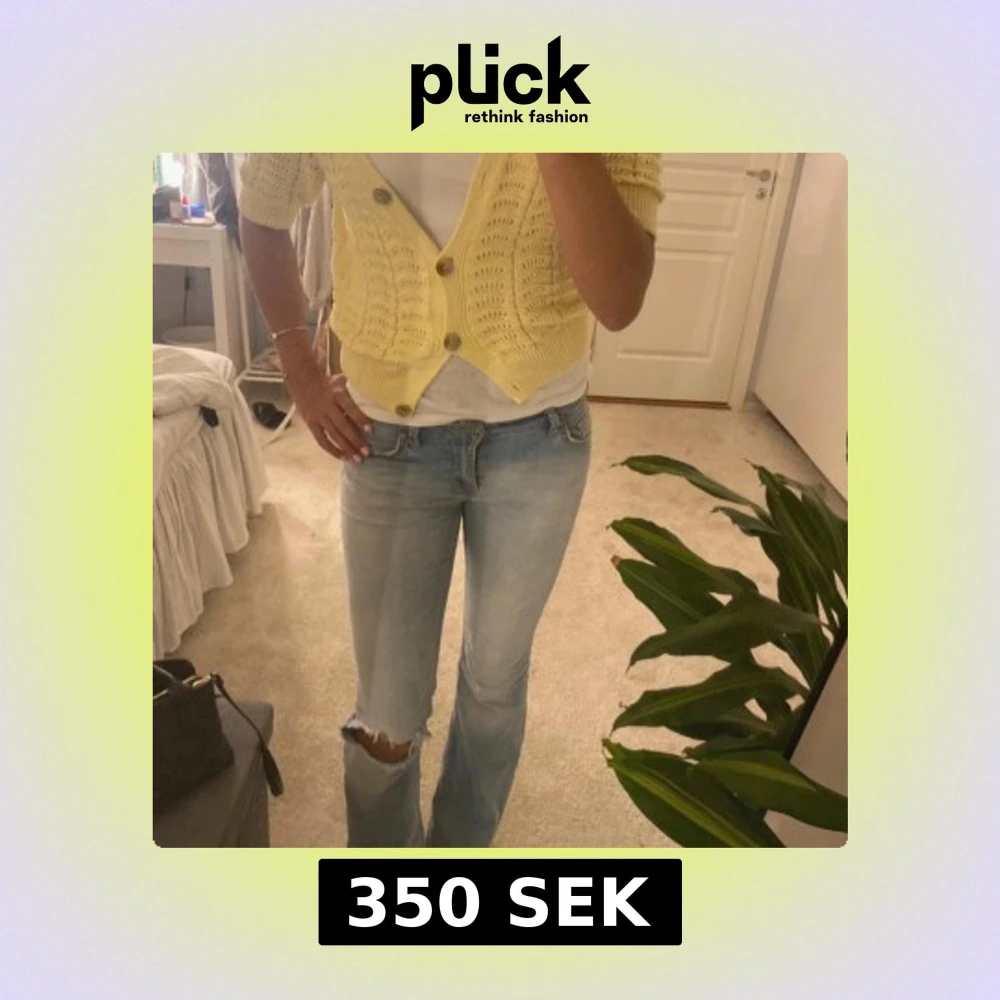 Säljer ett par ljusblå bootcut jeans med snygg slitning och hål på ena knät. Jeansen har låg midja och klassisk femficksmodell.