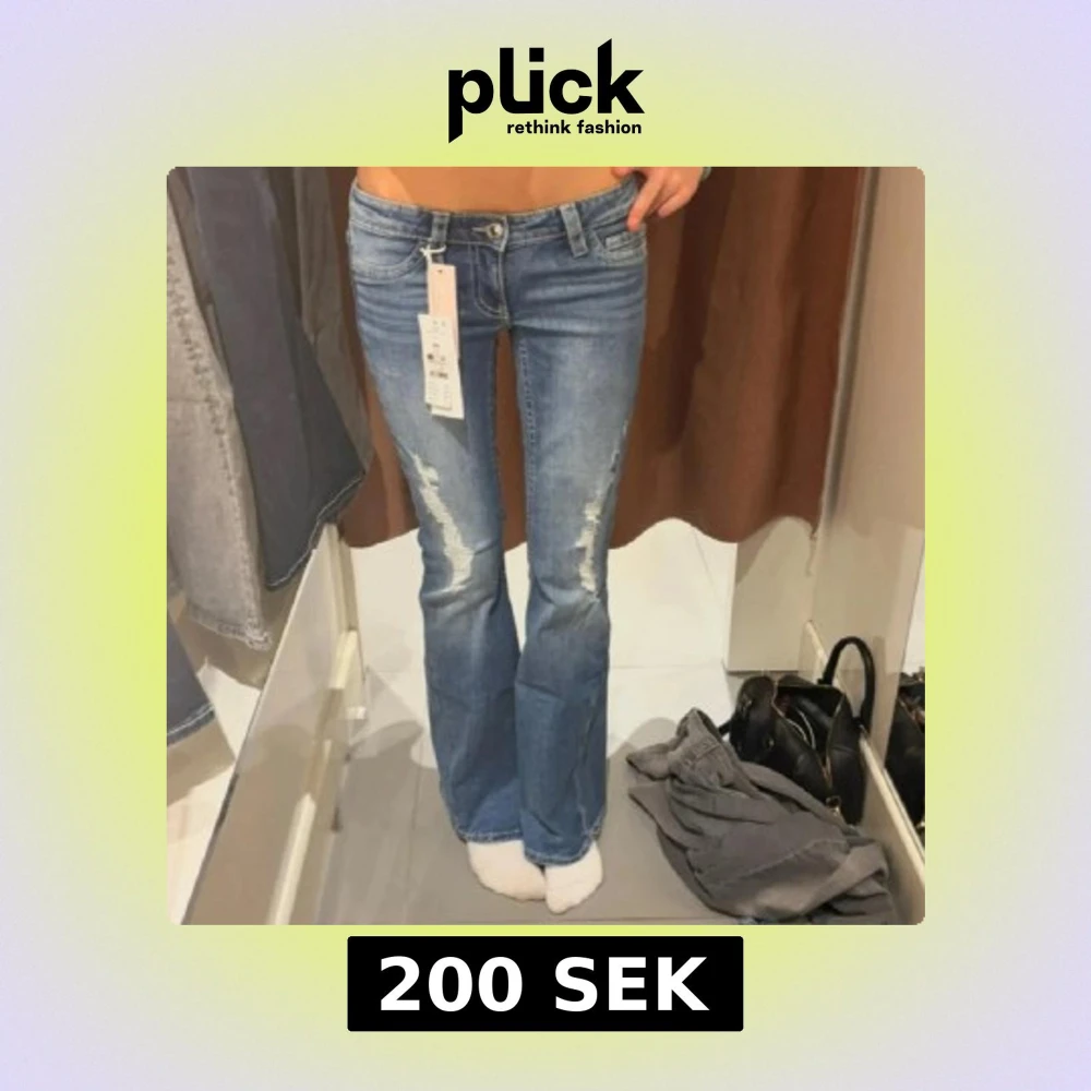 Snygga blå bootcut jeans med slitna detaljer framtill och klassiska fickor bak med knapp. Jeansen har låg midja och i storlek Xs.❤️