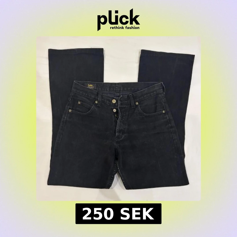 Svarta jeans från Lee i wide till bootcut. Jeansen har fem fickor, guldfärgade nitar och knappgylf. Materialet är robust denim i bomull. De är lite kortare än 34 i längd