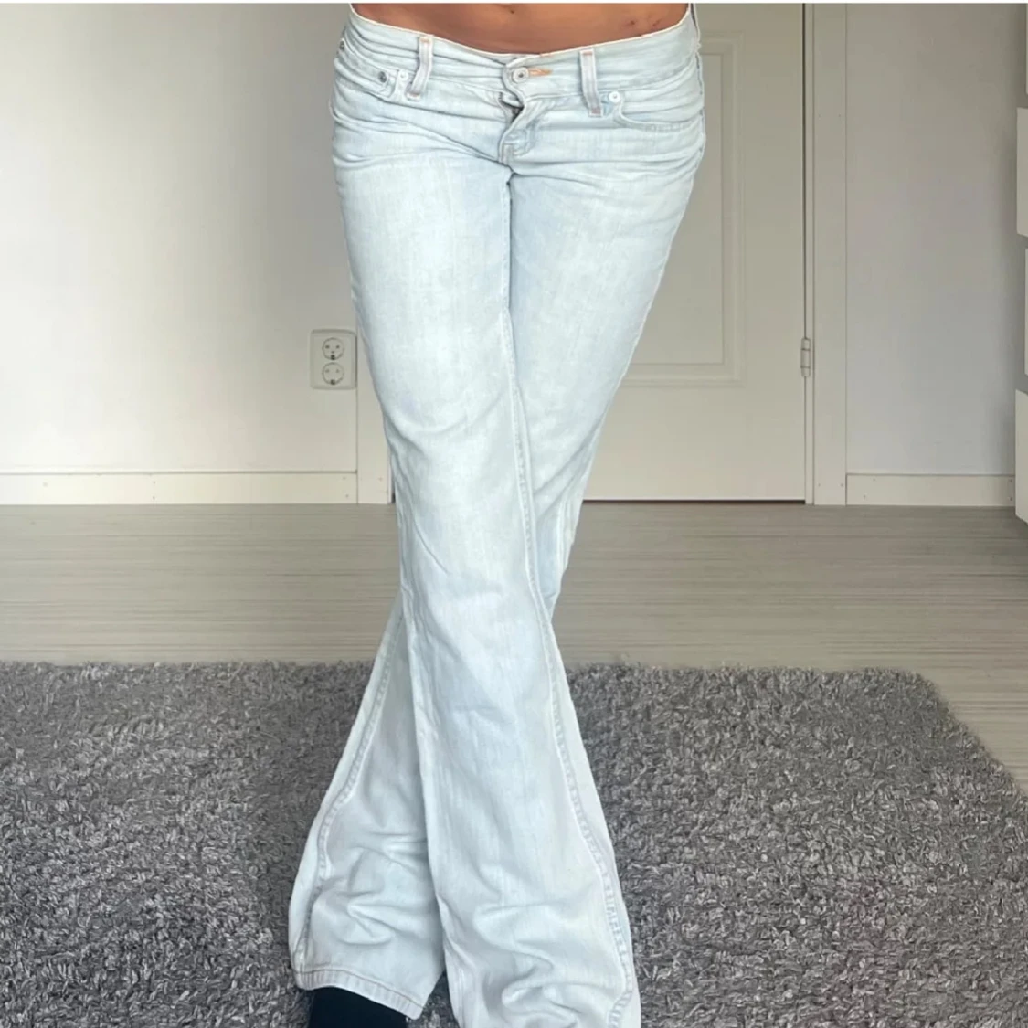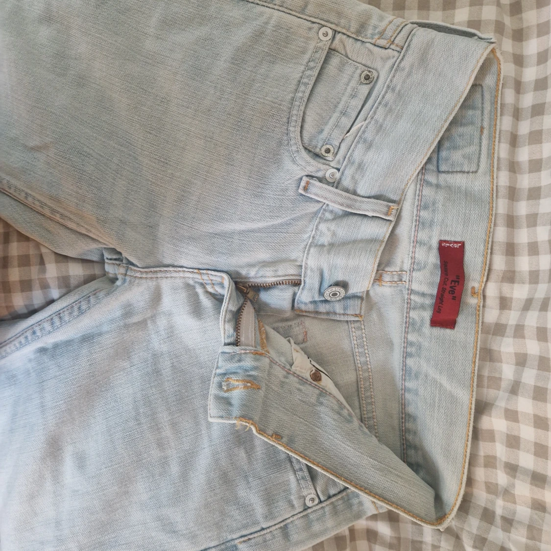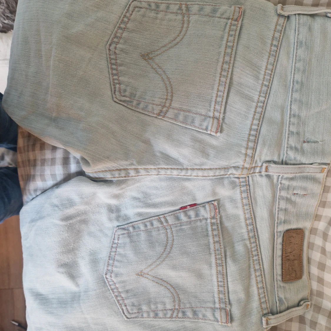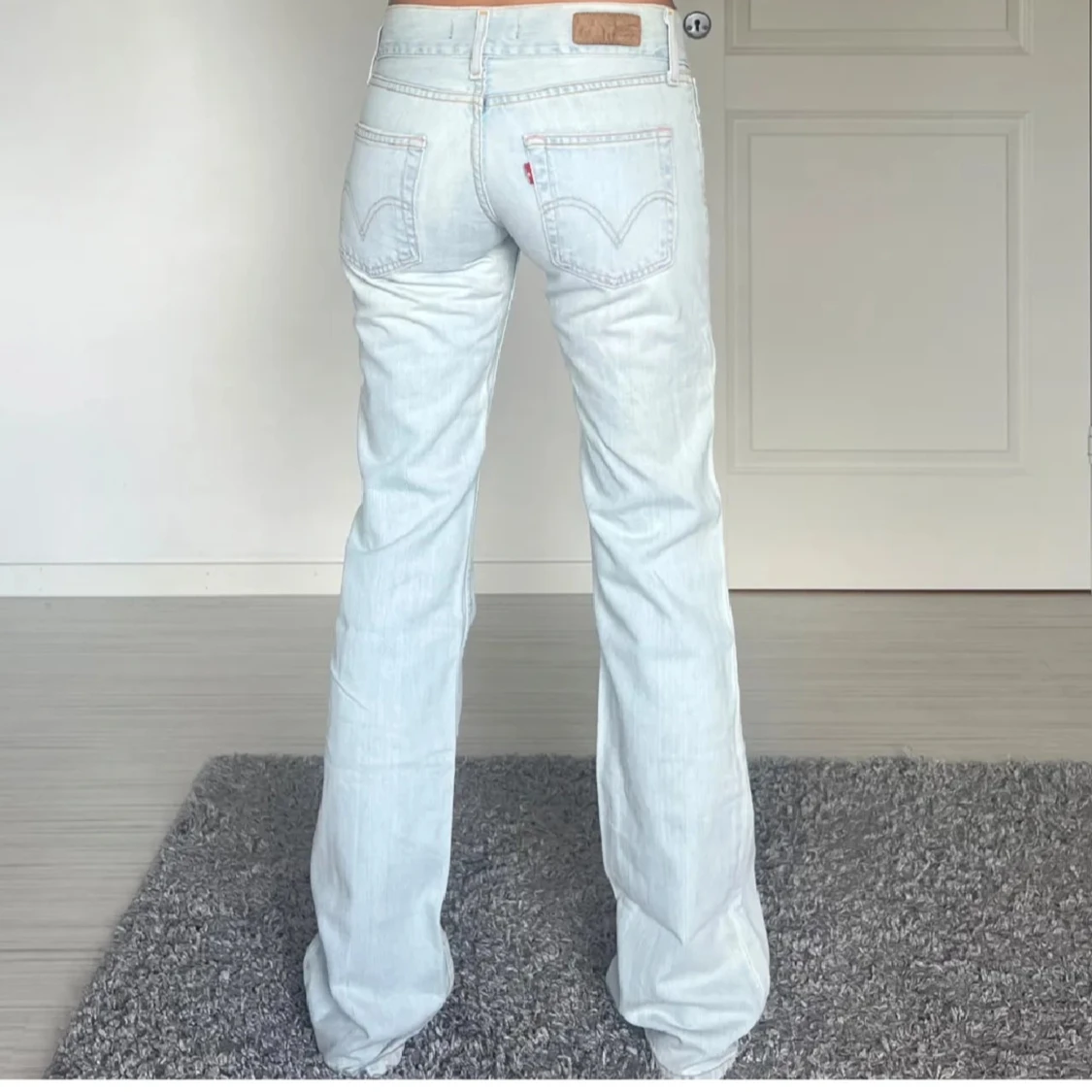 Säljer ett par ljusblå Levi's 527 jeans med bootcut passform som är lågmidjade. Köpte på plick men va tyvärr försmå, så första två bilderna är inte mina egna! Innerbenslängden är 84cm oxh midjemåttet rakt över är 36cm
