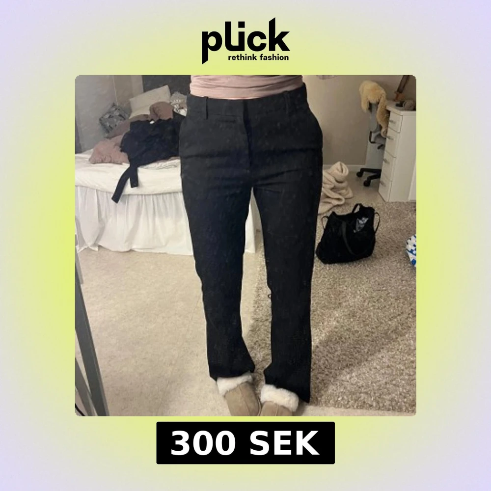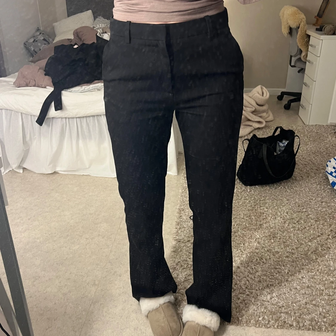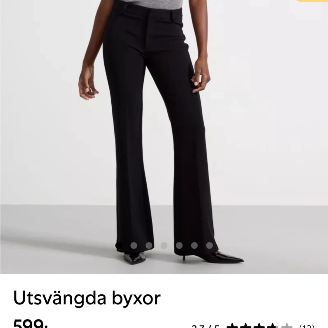 Snygga svarta utsvängda byxor med hög midja och stilren design. Perfekta för en trendig look. Byxorna har en klassisk passform och är tillverkade i ett bekvämt material. Säljer på grund av att de är lite för stora.