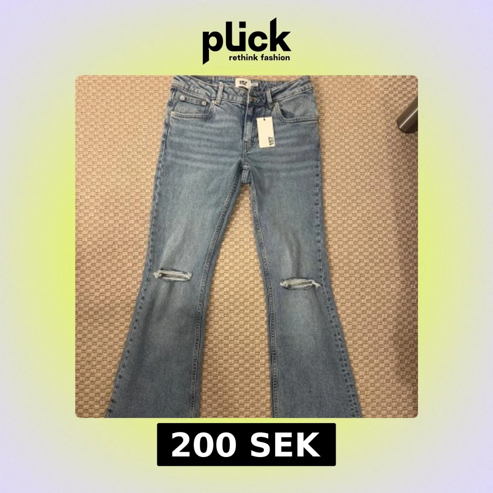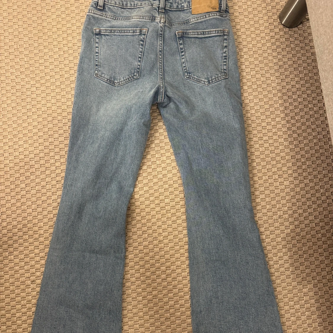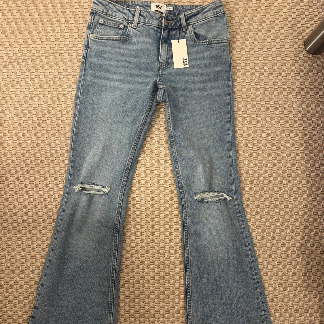 Aldrig använt Bootcut jeans i ljusblå denim från 157 med slitna detaljer vid knäna. Klassisk femficksmodell med dragkedja och knapp framtill. Jeansen har en lätt utsvängd passform nertill och är tillverkade i bomullsjeans.