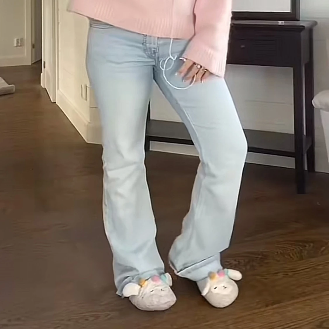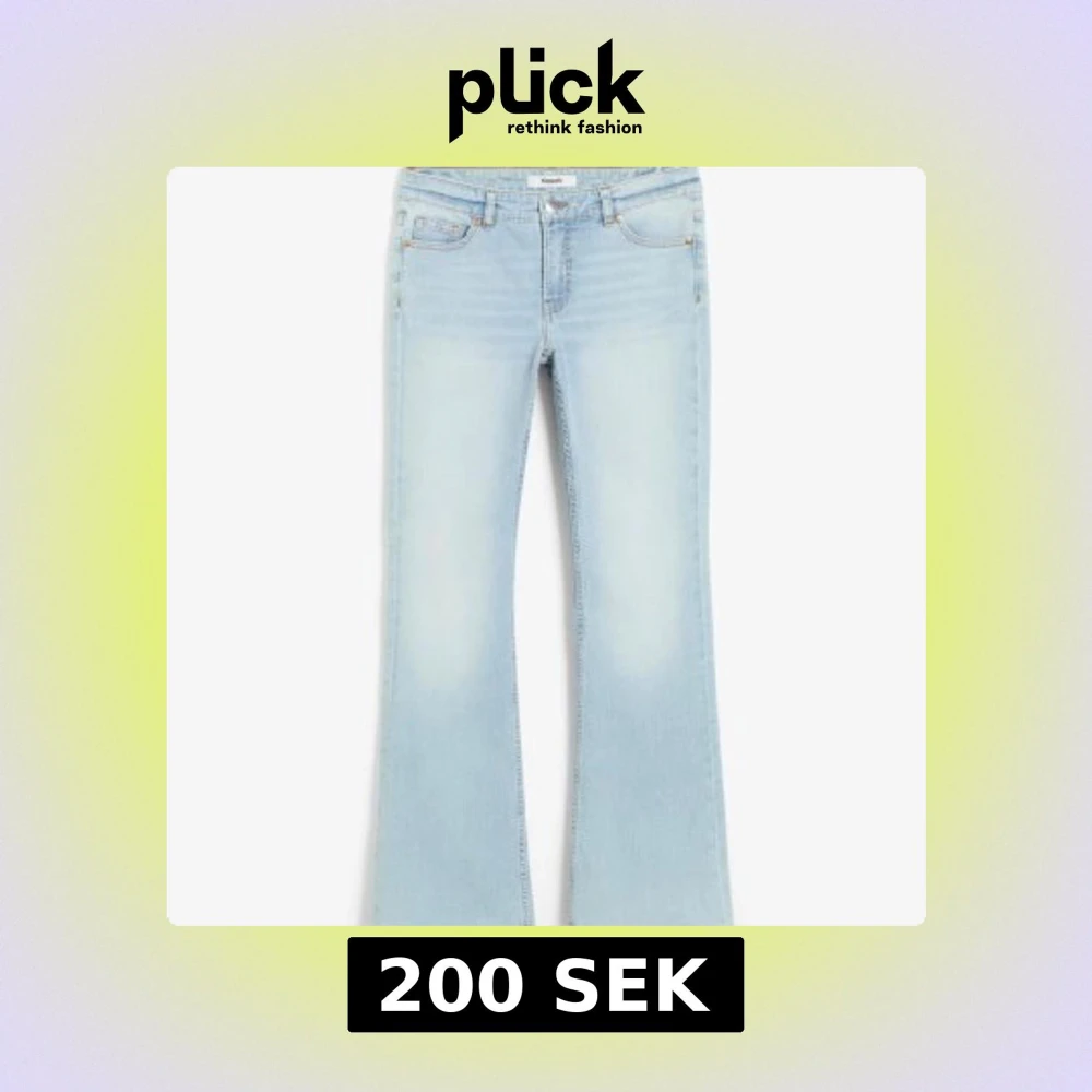 Snygga ljusblå jeans från Kappahl med klassisk femficksdesign och bootcut-ben. Jeansen har låg midja och är tillverkade i mjukt denimtyg som ger en skön passform. De är lite slitna längst ner i benen men annars bra,