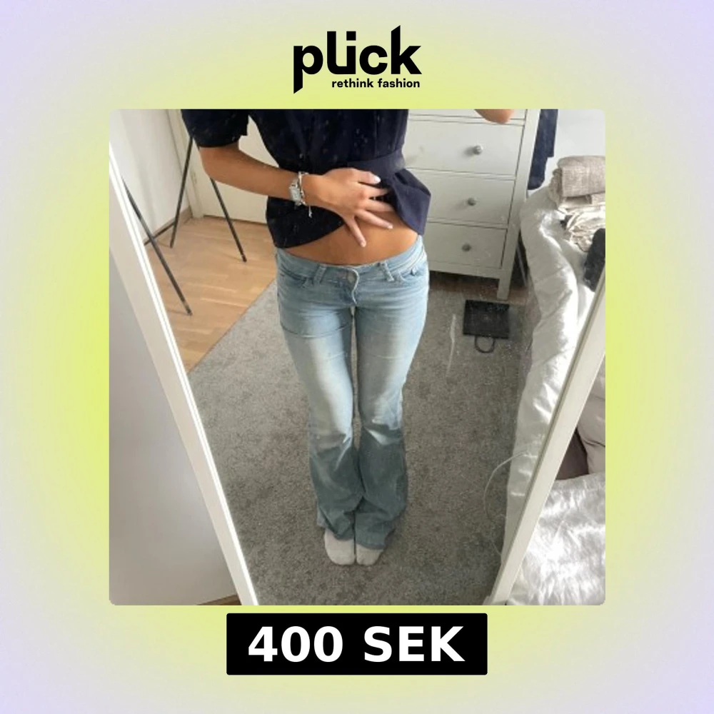 Säljer ett par ljusblå bootcut jeans med låg midja och snygga rosa broderade detaljer på bakfickorna. Jeansen har klassisk femficksdesign och är tillverkade i mjukt denimtyg som sitter skönt. Perfekt för dig som gillar retrovibbar och cool stil. obs slitningar längst nere men stör inte