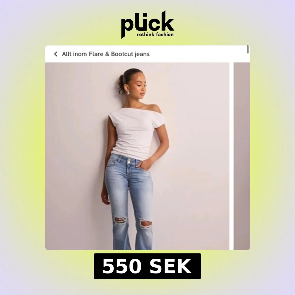 Bootcut jeans i ljusblå tvätt med slitna detaljer över knäna. Hög midja och klassisk femficksmodell med extra ficklock bak. Jeansen har dragkedjegylf och är tillverkade i mjukt denimtyg. Perfekta för en avslappnad och trendig look. Använda max 2-3 ggr och säljer då dem är för stora för mig.