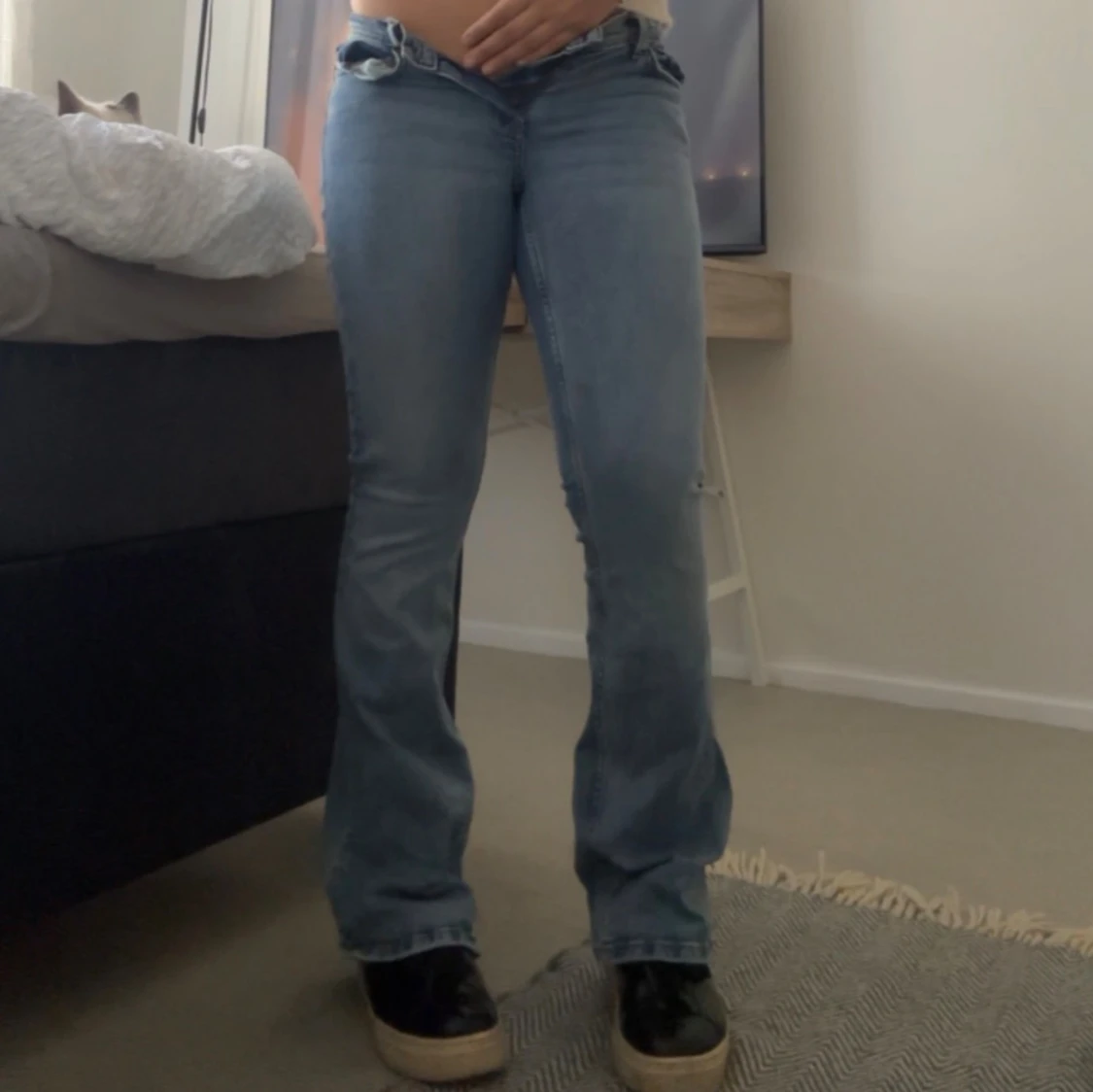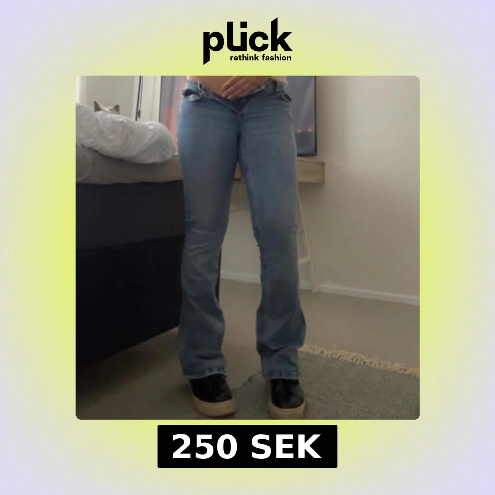 Säljer ett par ljusblå bootcut jeans med klassisk femficksdesign och normal passform. Jeansen har låg midja och är tillverkade i mjukt denimtyg som ger en snygg siluett. Perfekta för dig som gillar en retroinspirerad look.