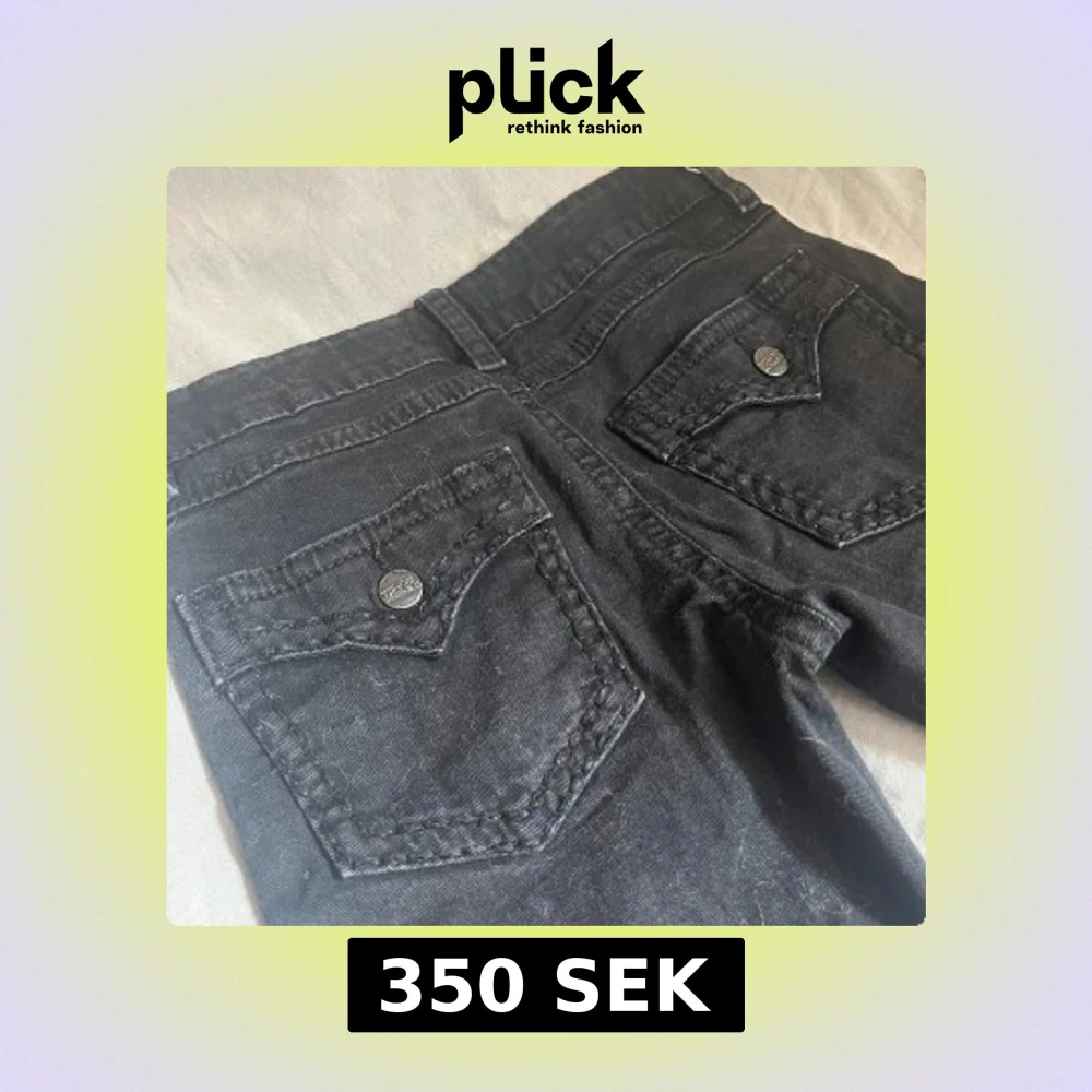 Säljer ett par svarta jeansbyxor med klassiska bakfickor och bootcut ben. Byxorna har normal passform och är perfekta för en stilren look. De har knapp och dragkedja framtill samt bälteshällor i midjan.