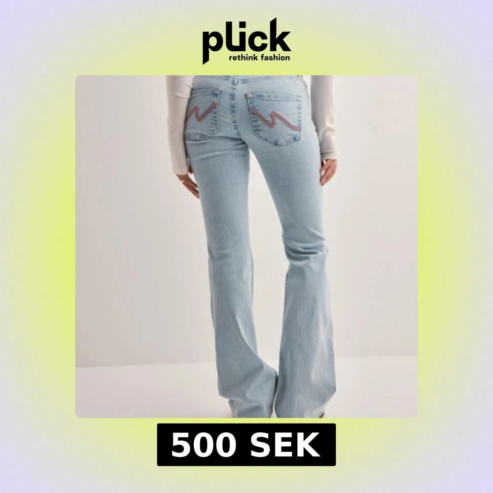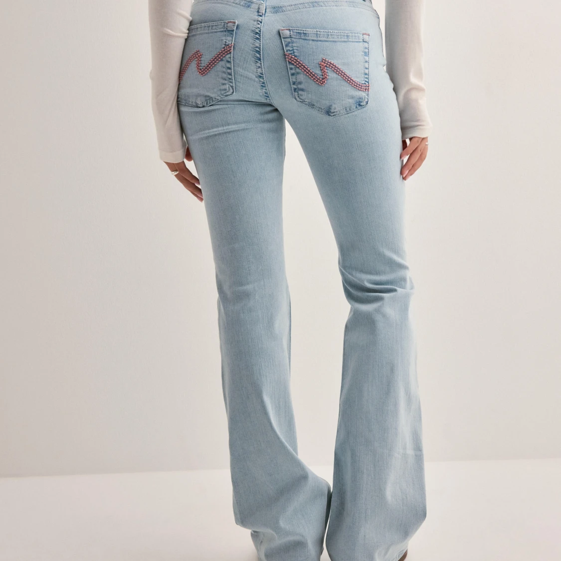Ljusblå bootcut jeans med slitna knän och broderade detaljer på bakfickorna. Jeansen har hög midja och är tillverkade i klassiskt denimtyg. Perfekta för en avslappnad och trendig look.