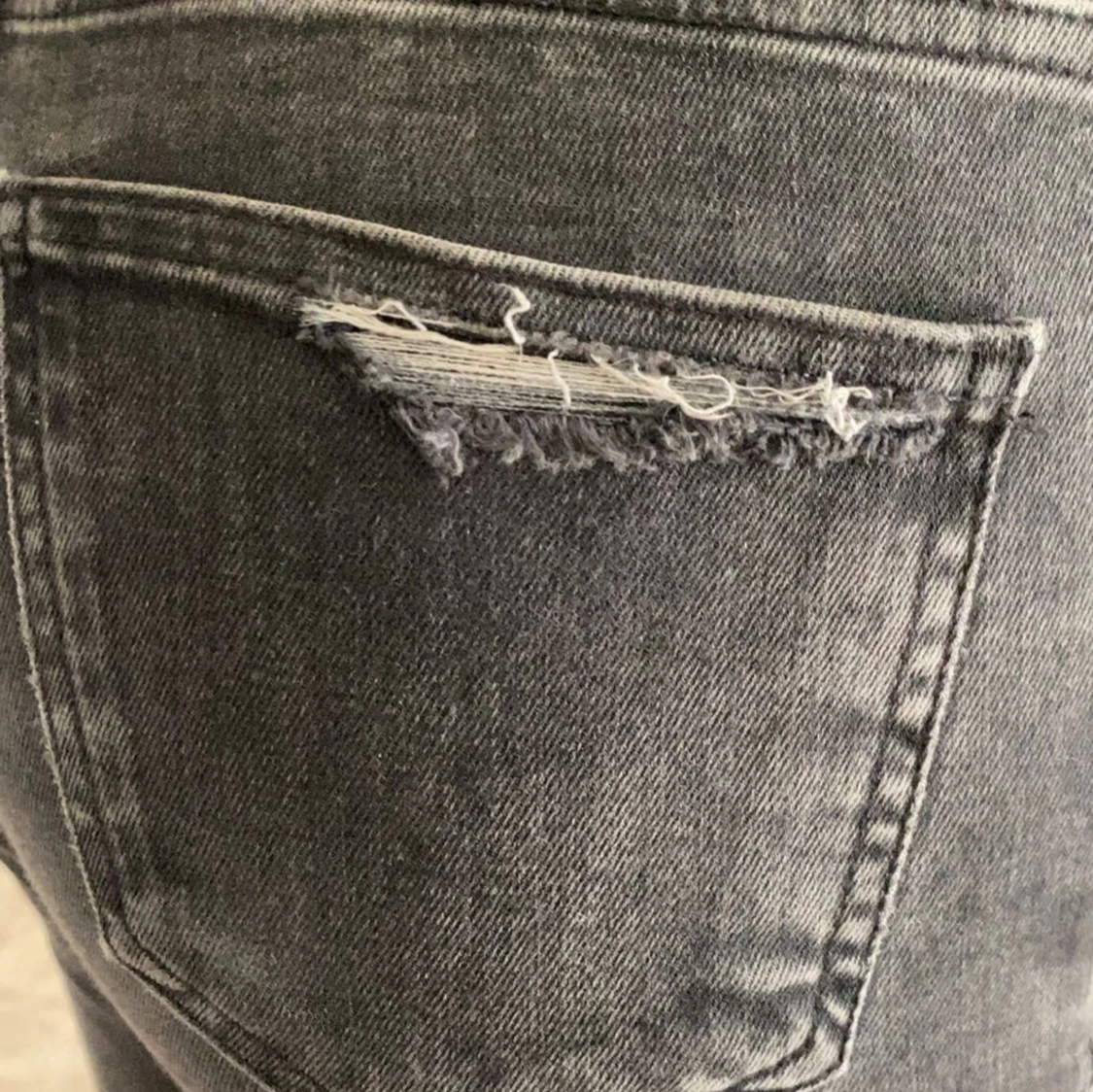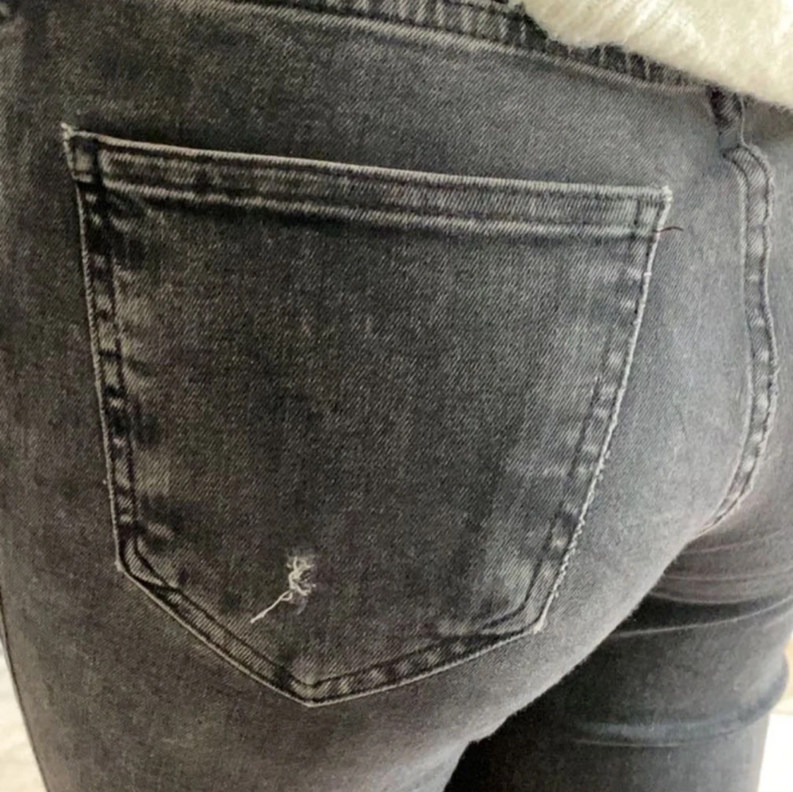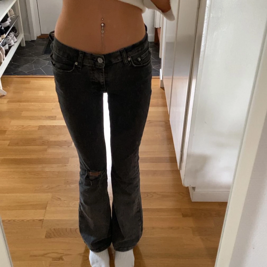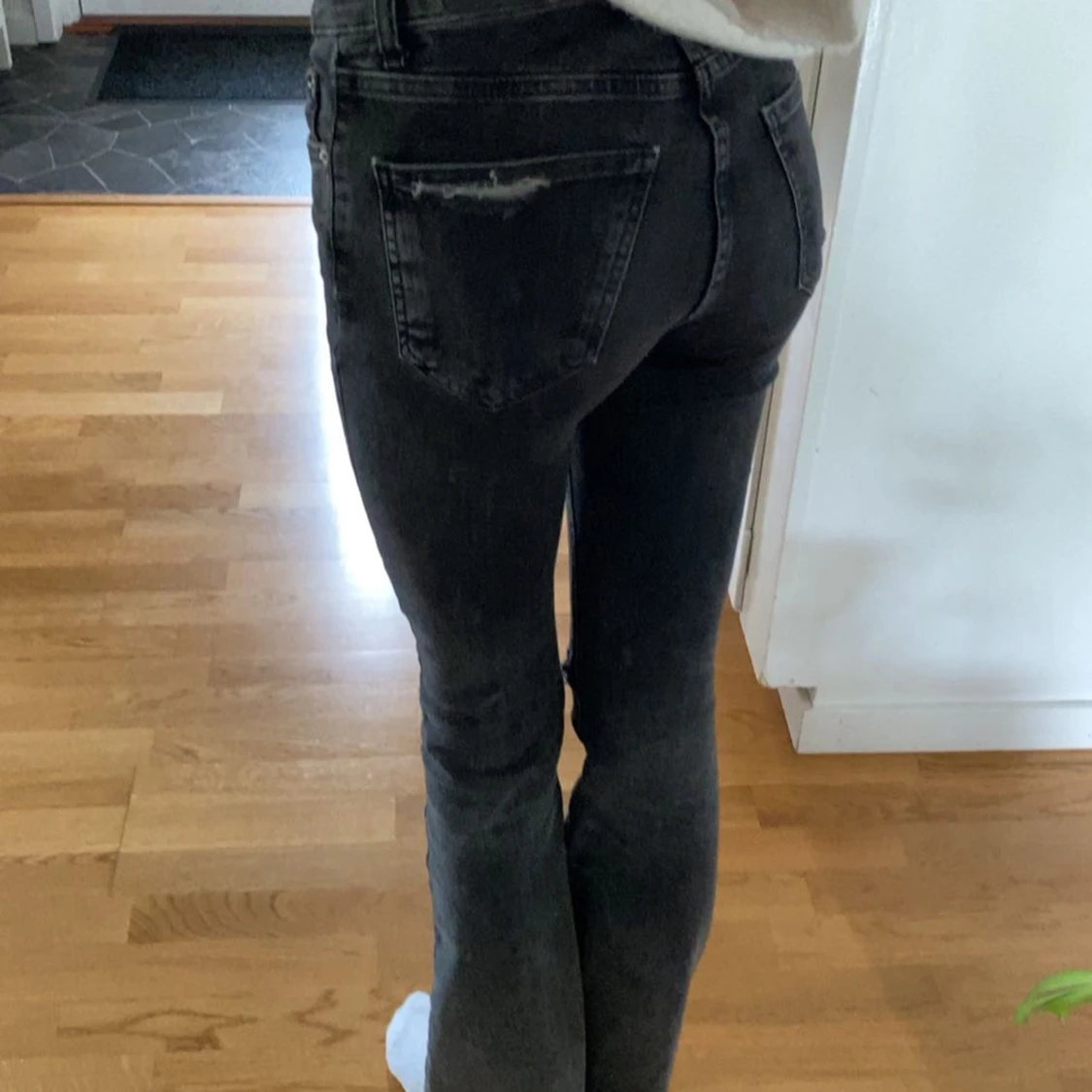 Säljer ett par jättesnygga mörkgråa bootcut jeans från Gina tricot med låg midja och snygga slitningar på ett knä. Jeansen har små defekter på bakfickorna.