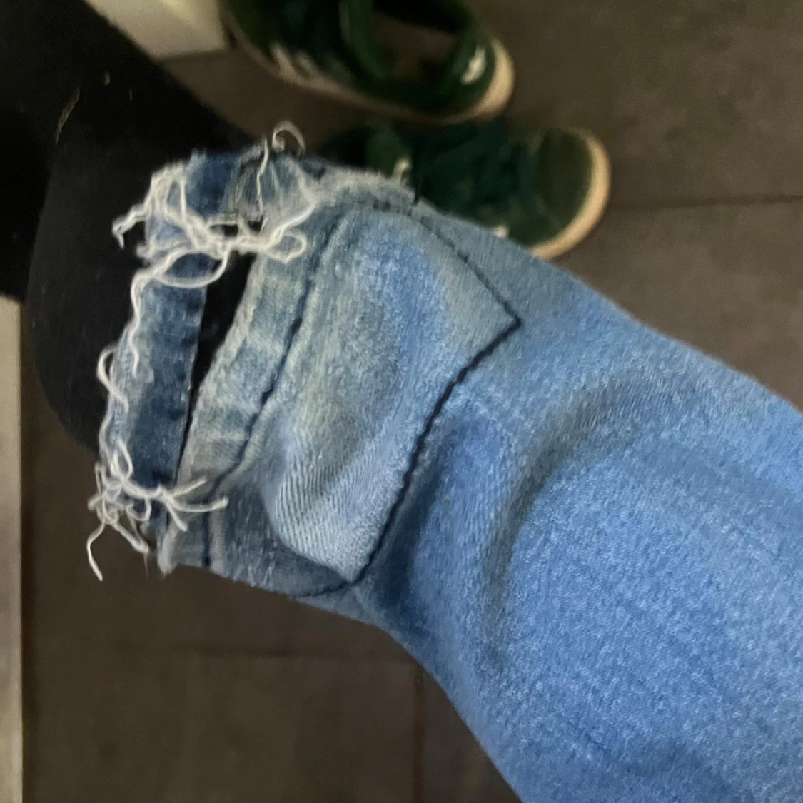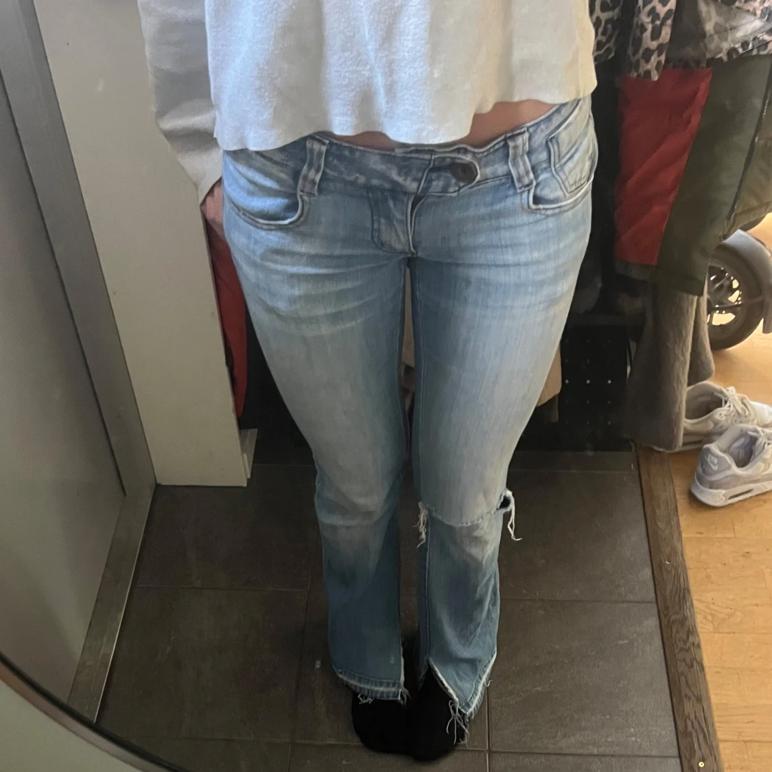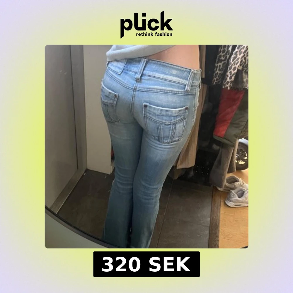 Säljer ett par ljusblå jeans med bootcut passform och låg midja. Jeansen har slitna detaljer vid bensluten och klassiska bakfickor. Perfekta för en avslappnad och trendig look.