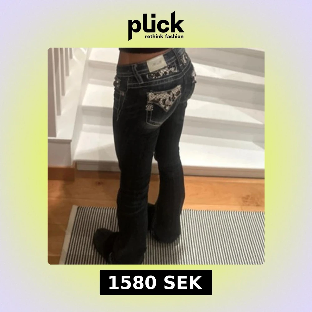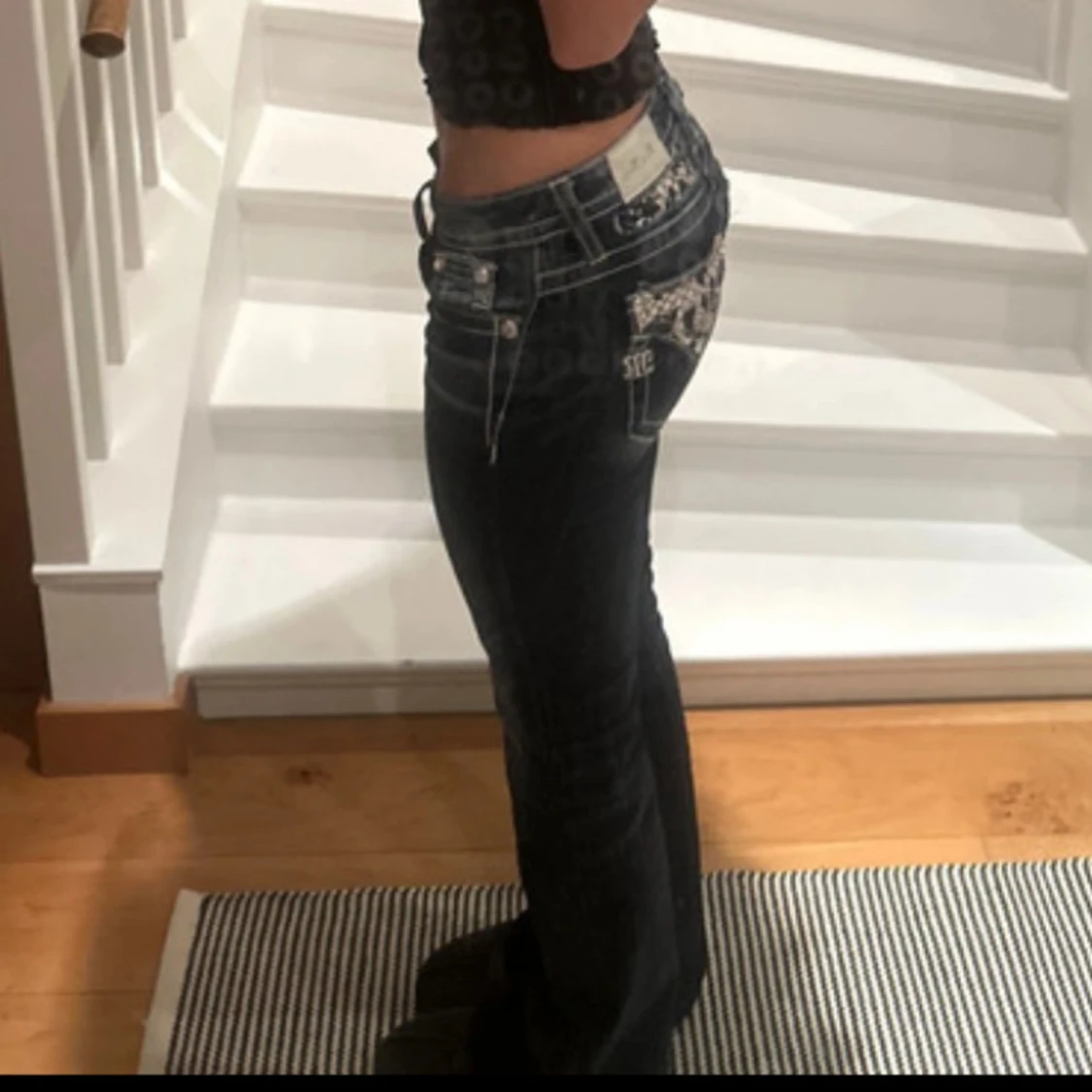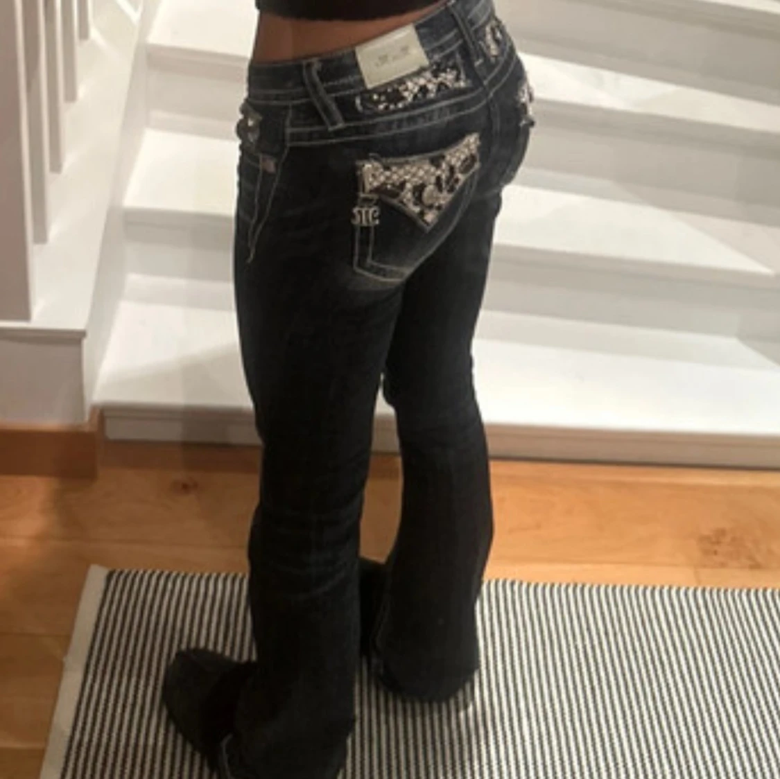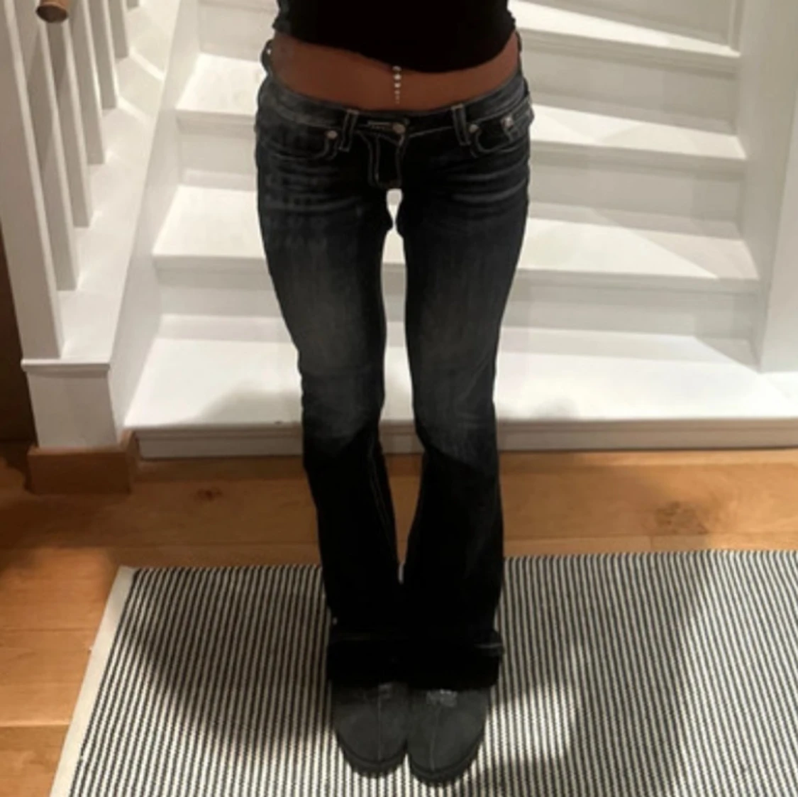 Snygga mörkblå jeans med låg midja och bootcut-ben. Säljer då de inte kommer till användning, storlek W24, köptes för 2200kr men pris kan diskuteras 💞