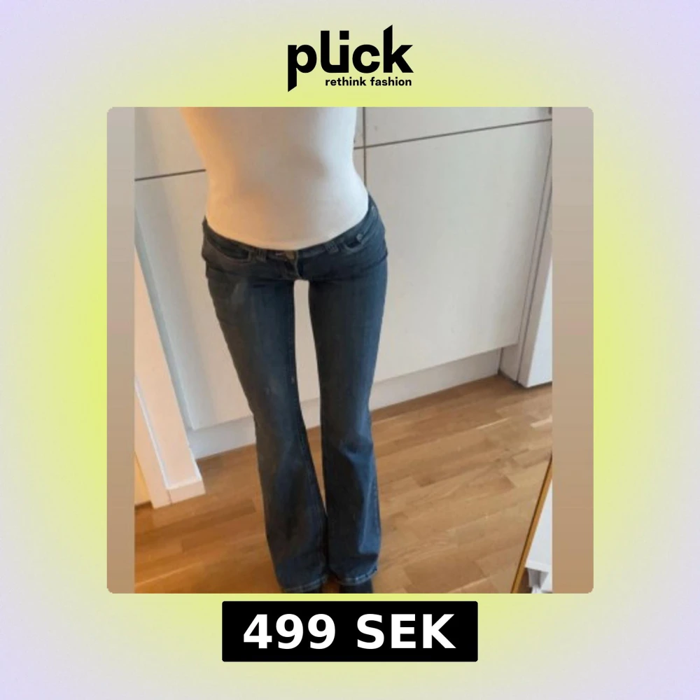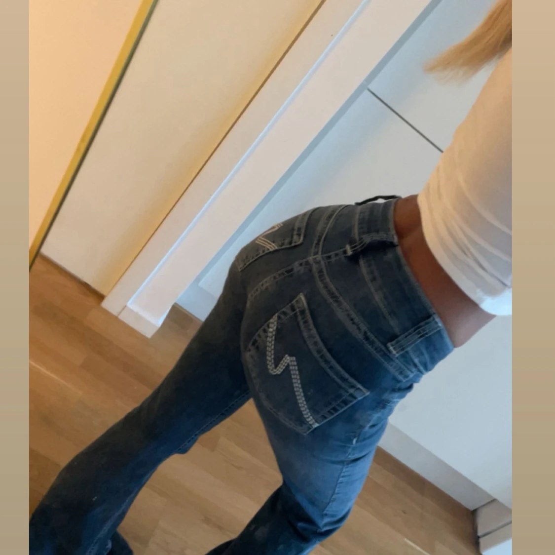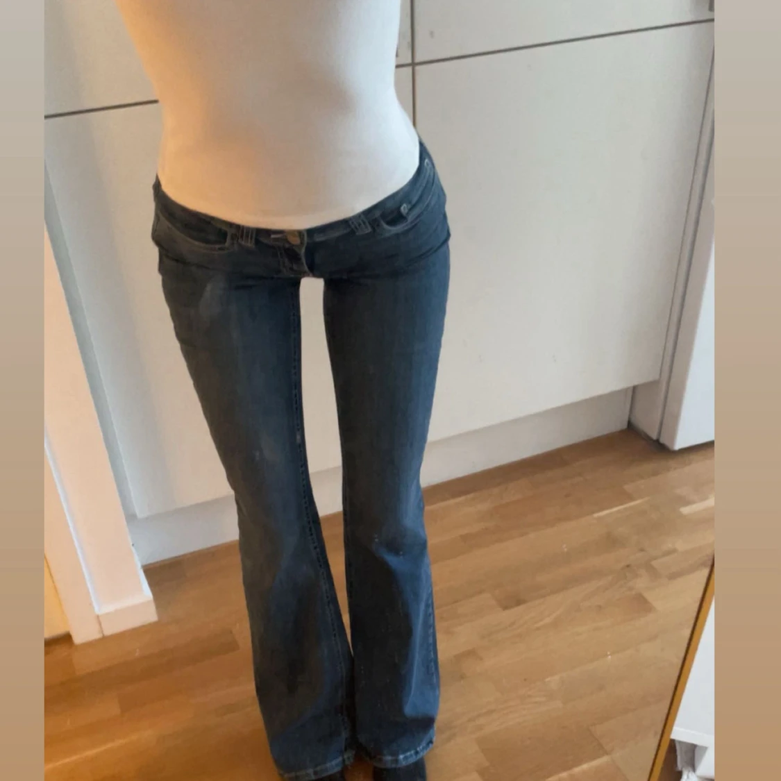 Snygga blå jeans med bootcut-modell och låg midja. Jeansen har klassiska fickor och coola detaljer på bakfickorna med kontrastsömmar.