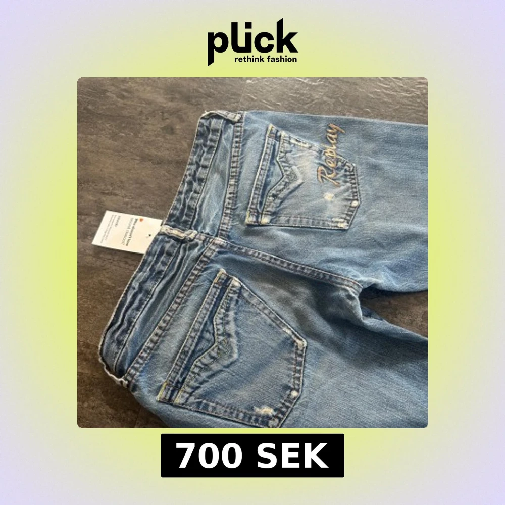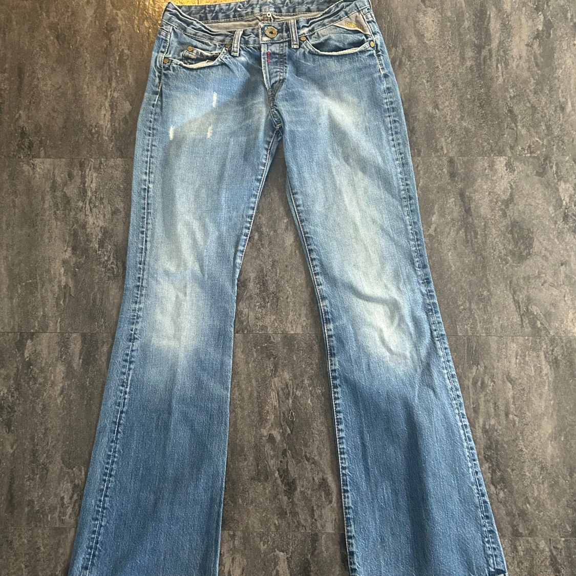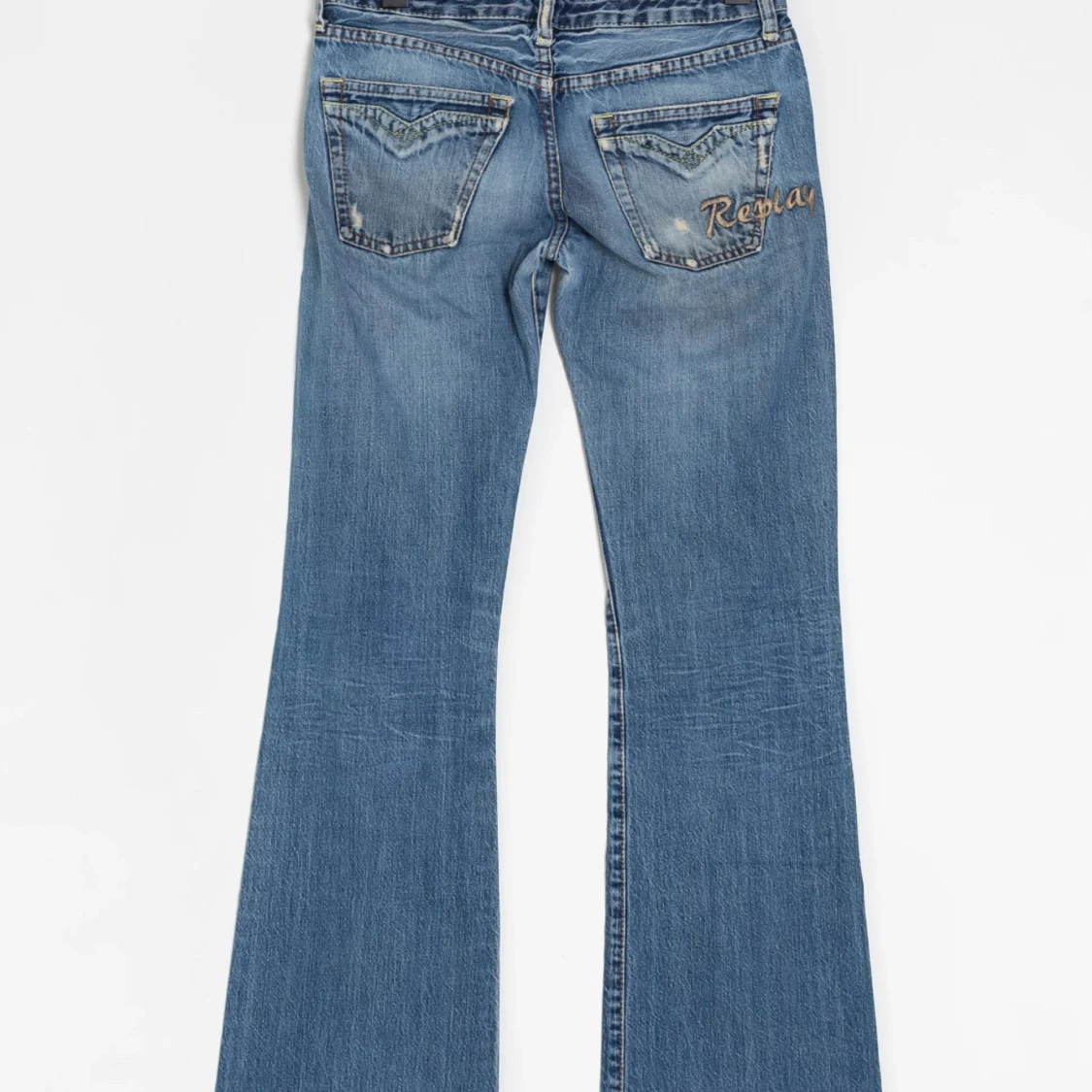 Snygga blå lågmidjade jeans från Replay med bootcut-stil och slitna detaljer. Midjemått: ca 35 cm och innerbenslängden: 76 cm. De har lite slitage längst ner men verkligen inget man tänker på. Köpta för ca 750 kr, kom privat för fler bilder.💕
