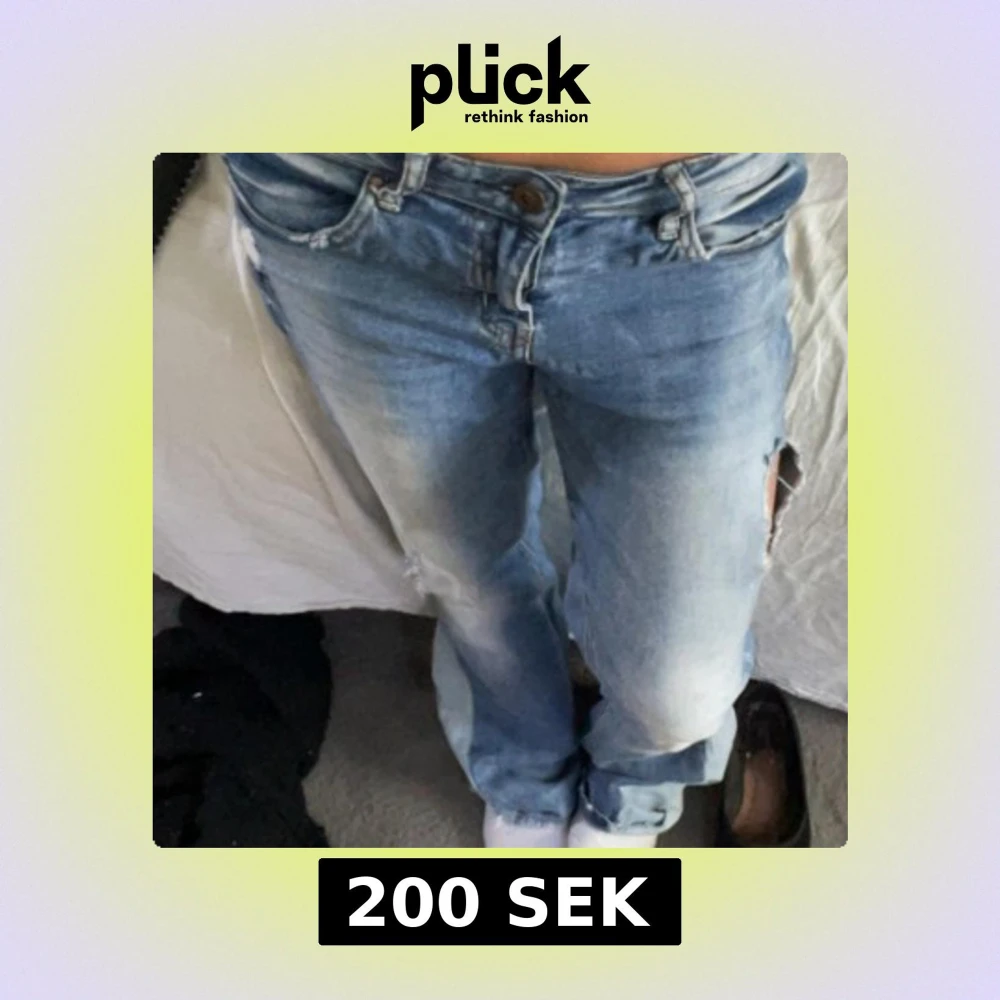 Säljer ett par ljusblå bootcut jeans med slitningar och hål på låret. Jeansen har låg midja och är i klassisk denim med snygg tvätt och slitna detaljer. Perfekta för en avslappnad och trendig look.