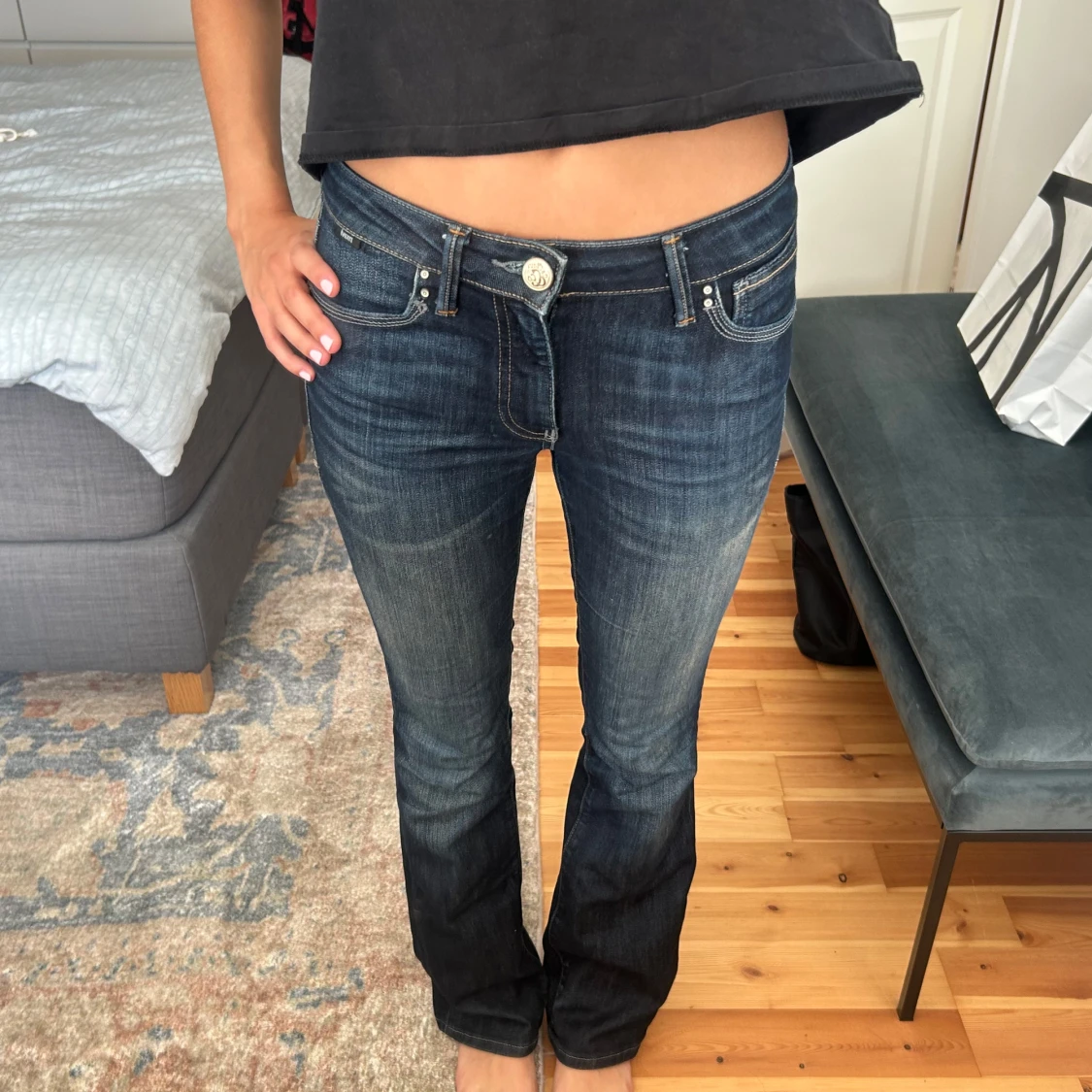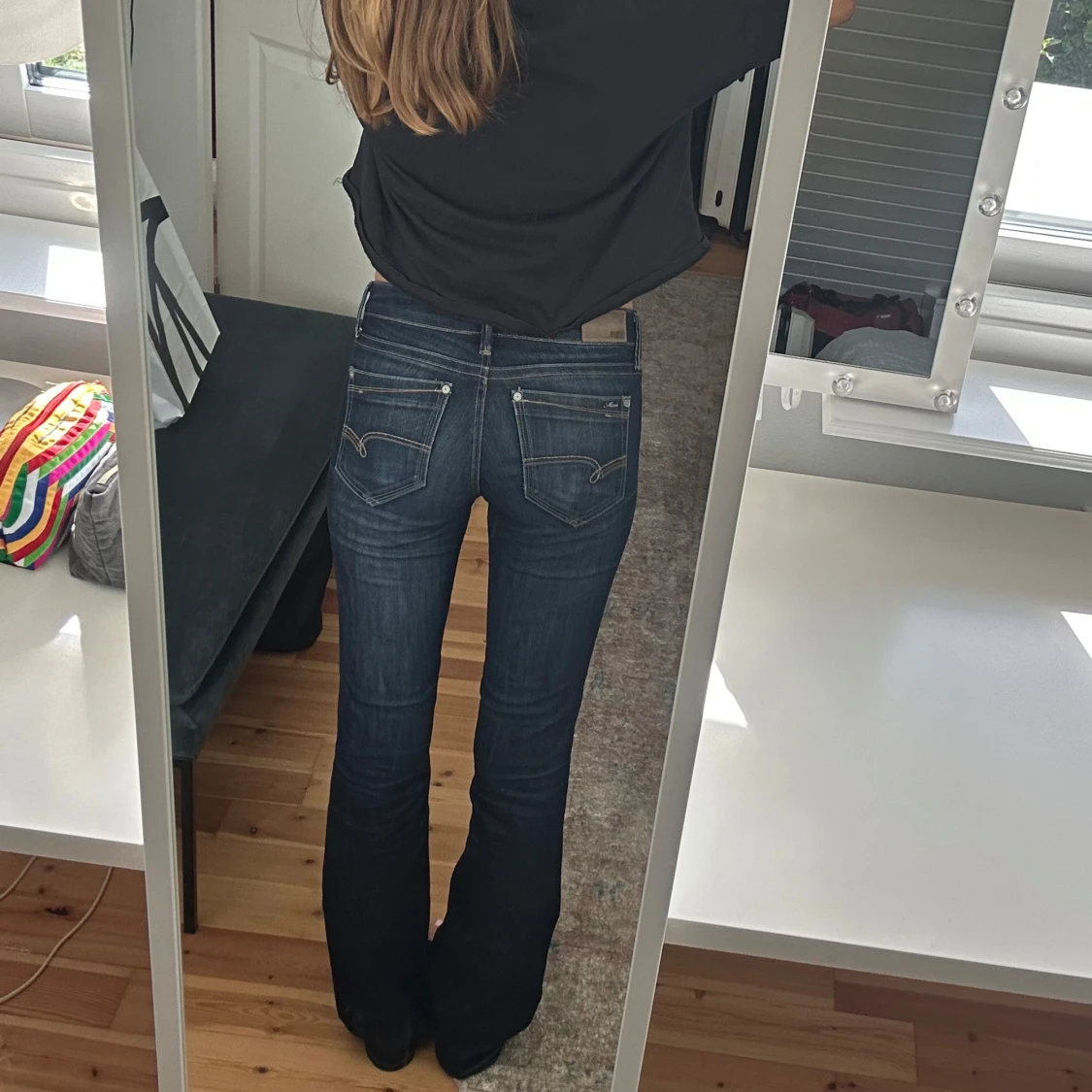 Snygga mörkblå jeans från Mavi med bootcut passform och låg midja. Dom är en mörkblå ”urtvättad” färg och kommer inte längre till användning!