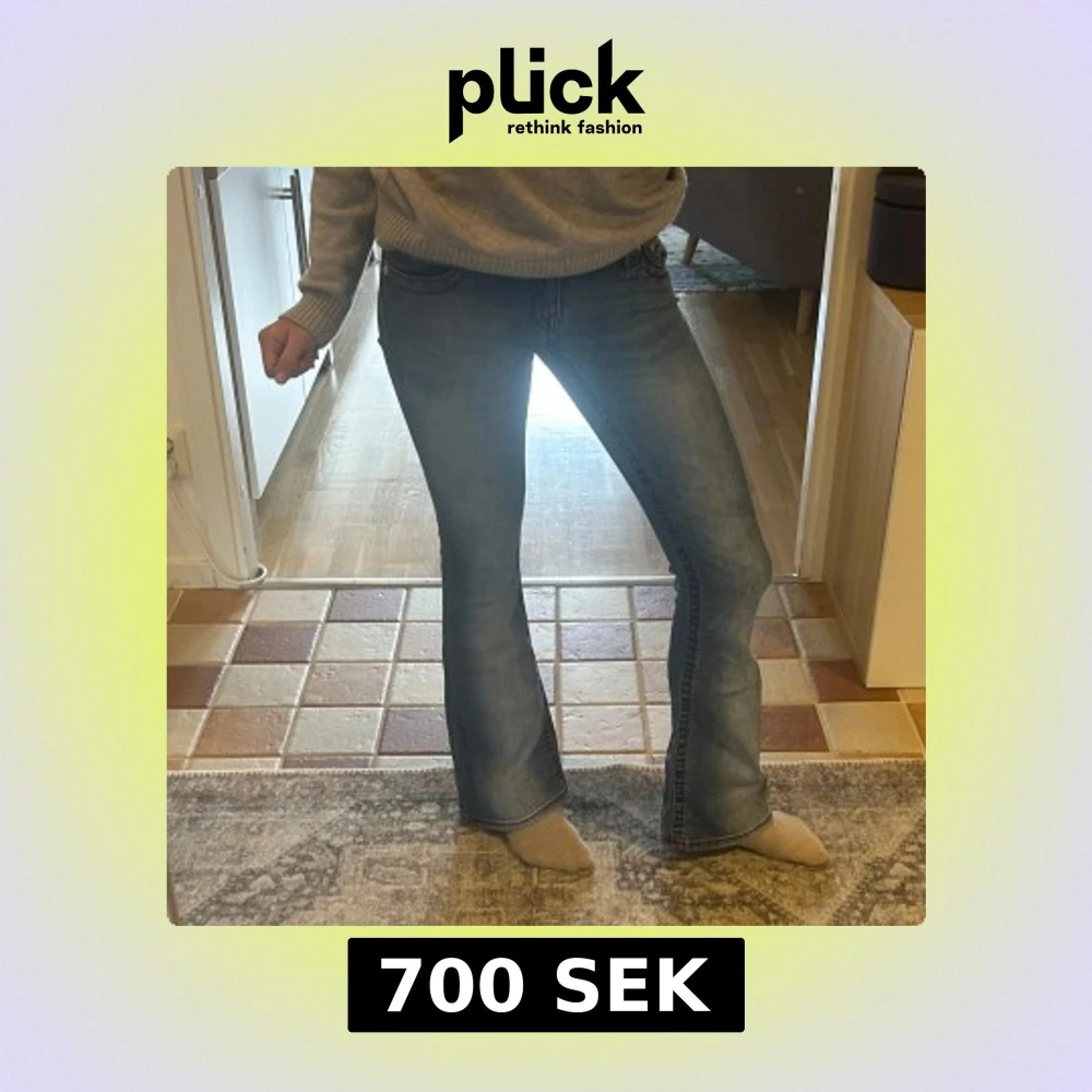 Snygga blå jeans från True Religion med klassisk bootcut-passform och låg midja köpta från Nelly. Jeansen har tydliga sömmar och ikoniska bakfickor med broderad detalj. Materialet är jeans med lätt tvättad look och silverfärgad knapp framtill. Midjemått-37 cm lår mått-21,5 cm innerbenslängd-76,5. Skriv om du undrar något💕