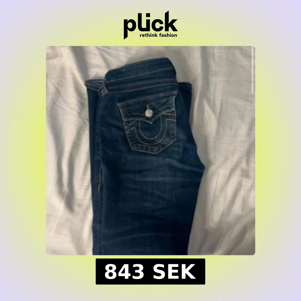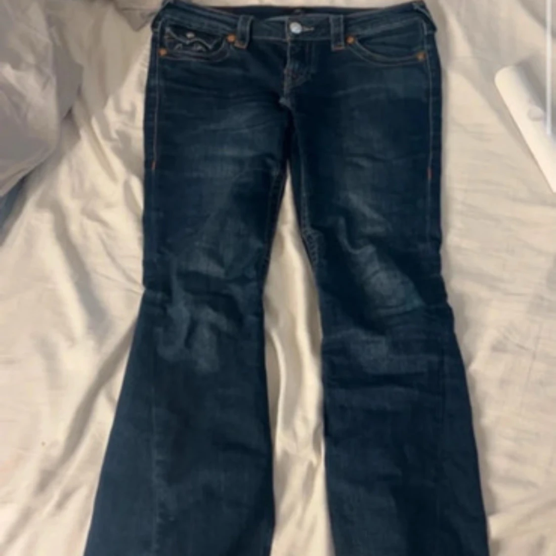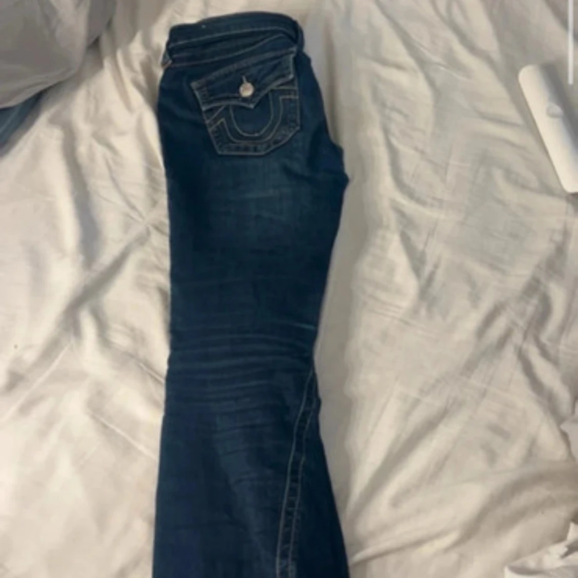 Snygga mörkblå jeans från True Religion med bootcut passform. Jeansen har klassiska kontrastsömmar och ikonisk fickdetalj med lock och knapp bak. Knappt använda 1-3 gånger, vill sälja så fort som möjligt!! Kontakta innan köp! Lite förstörda längst ner men går att klippa bort/vika upp!