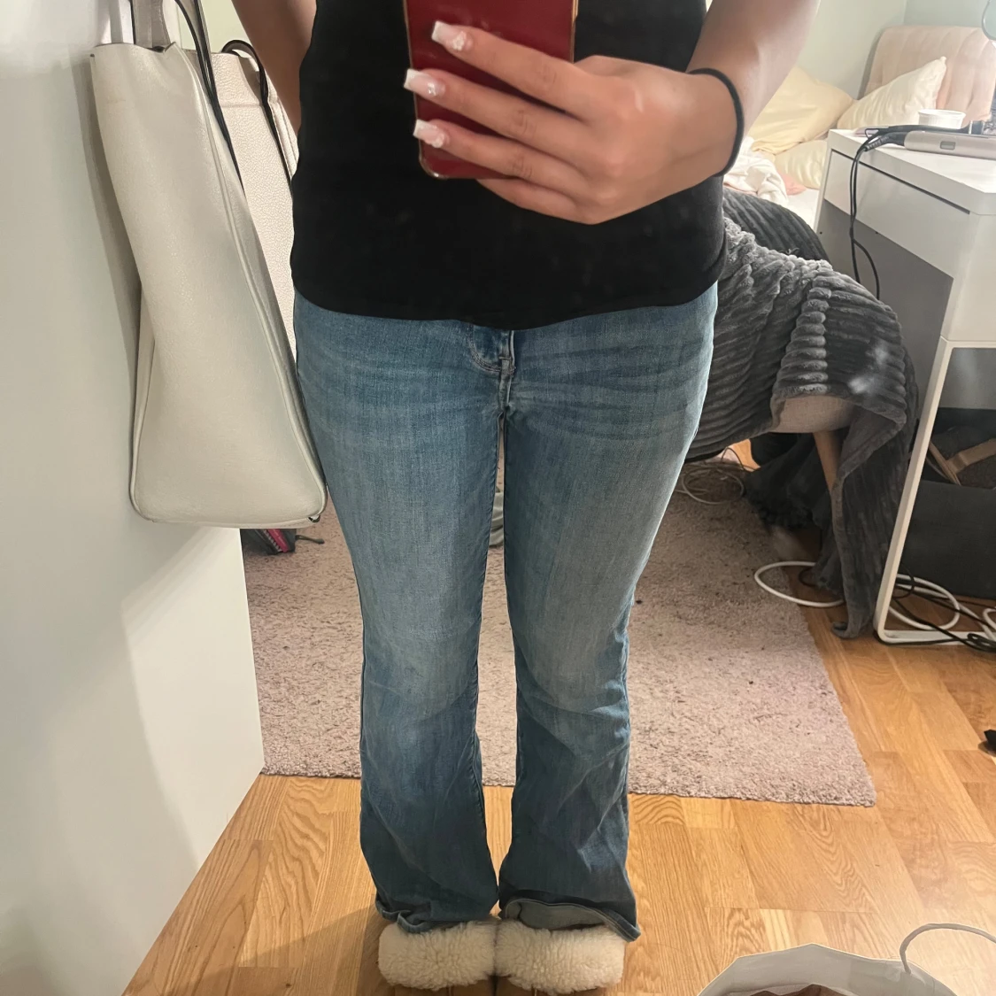 Säljer ett par snygga blå bootcut jeans i bra skick. De har en klassisk design med en bekväm passform. 💕