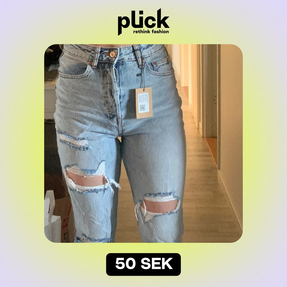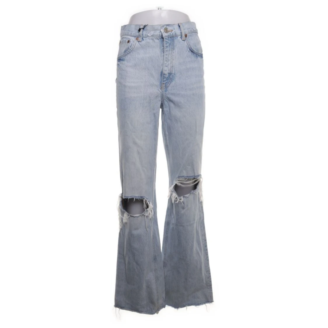 Säljer ett par snygga ljusa jeans med hög midja och hål på knäna. De har en bootcut-stil och är tillverkade i jeansmaterial. Perfekta för en avslappnad och trendig look! Mycket bra skick!