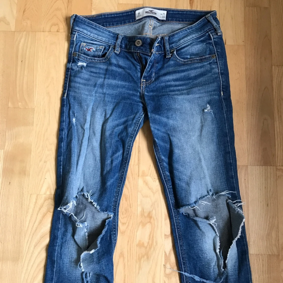 Blåa jeans med hål på knäna från Hollister, W25 L33