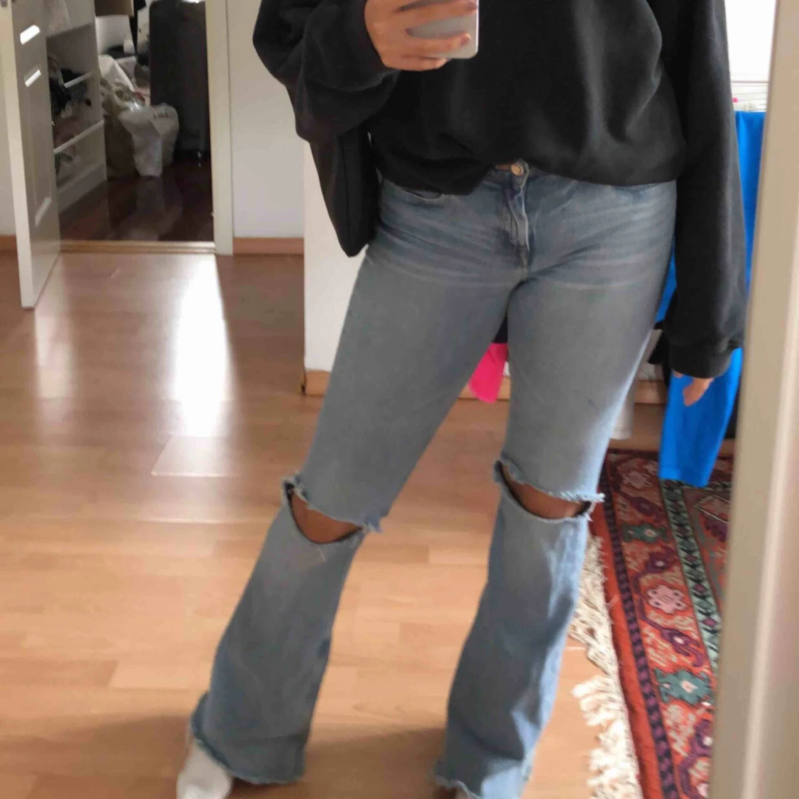 Säljer dessa skitsnygga och bekväma utsvängda jeans från Zara som jag även klippt egna hål! Köparen står för frakten annars kan jag mötas upp i Stockholm!💕🌈💛
