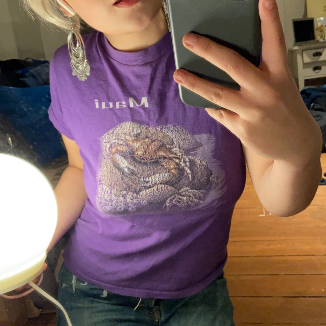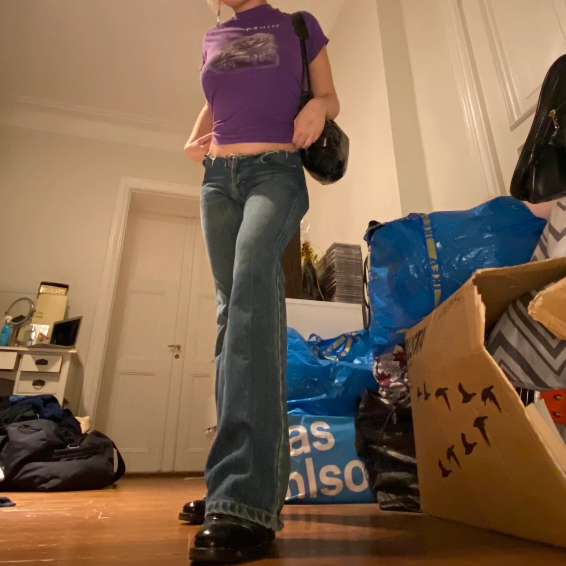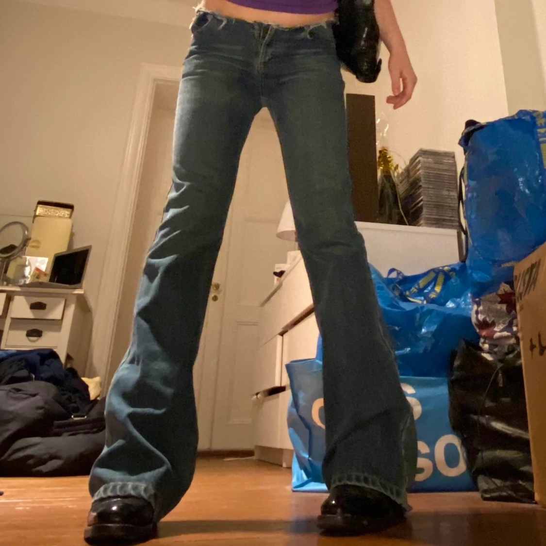 Jeans: jäääättenajs superbootcut jeans med avklippt överdel, sjukt långa vilket e jättenajs med klackar som på bilden! Finns ingen storlek eftersom lappen e bortklippt men jag är en w28/29 ungefär! 200kr! Tshirt: lila maui tshirt, slutar precis på min midja, printet på framsidan är väldigt slitet så säljer för ba 40kr!