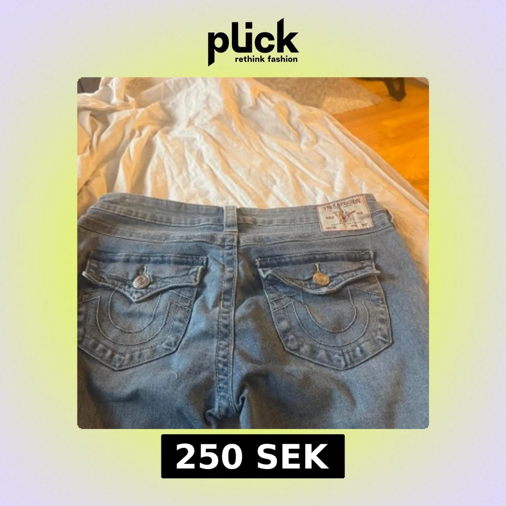 Snygga blå jeans från True Religion i modellen Joey Low Rise Flare. Använt ganska mycket och har synliga tecken på användning. Knappen vid fickan där fram har lossnat och hål på ena sidan vid slutet av benet. Köpta för 1200kr.