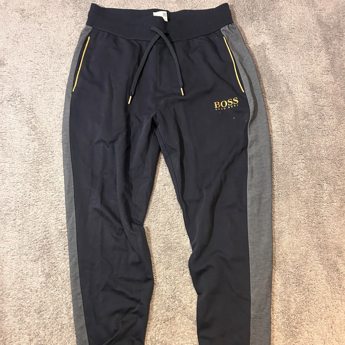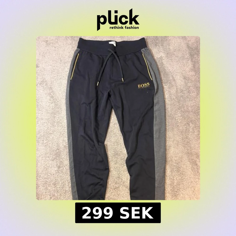 Snygga svarta mjukisbyxor från BOSS med grå sidopaneler och gula detaljer vid fickorna. Byxorna har dragsko i midjan och BOSS-logga på låret. Perfekta för en chill och sportig stil. Äkta och aldrig använda.