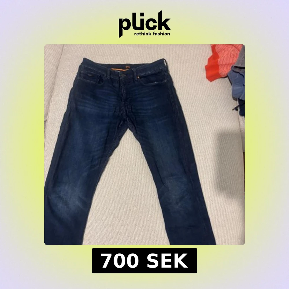 Säljer ett par mörkblå jeansbyxor från BOSS, modell Delaware. Klassisk femficksdesign med orange detaljer på insidan. Snygg passform och stilren look, perfekta till många olika outfits.