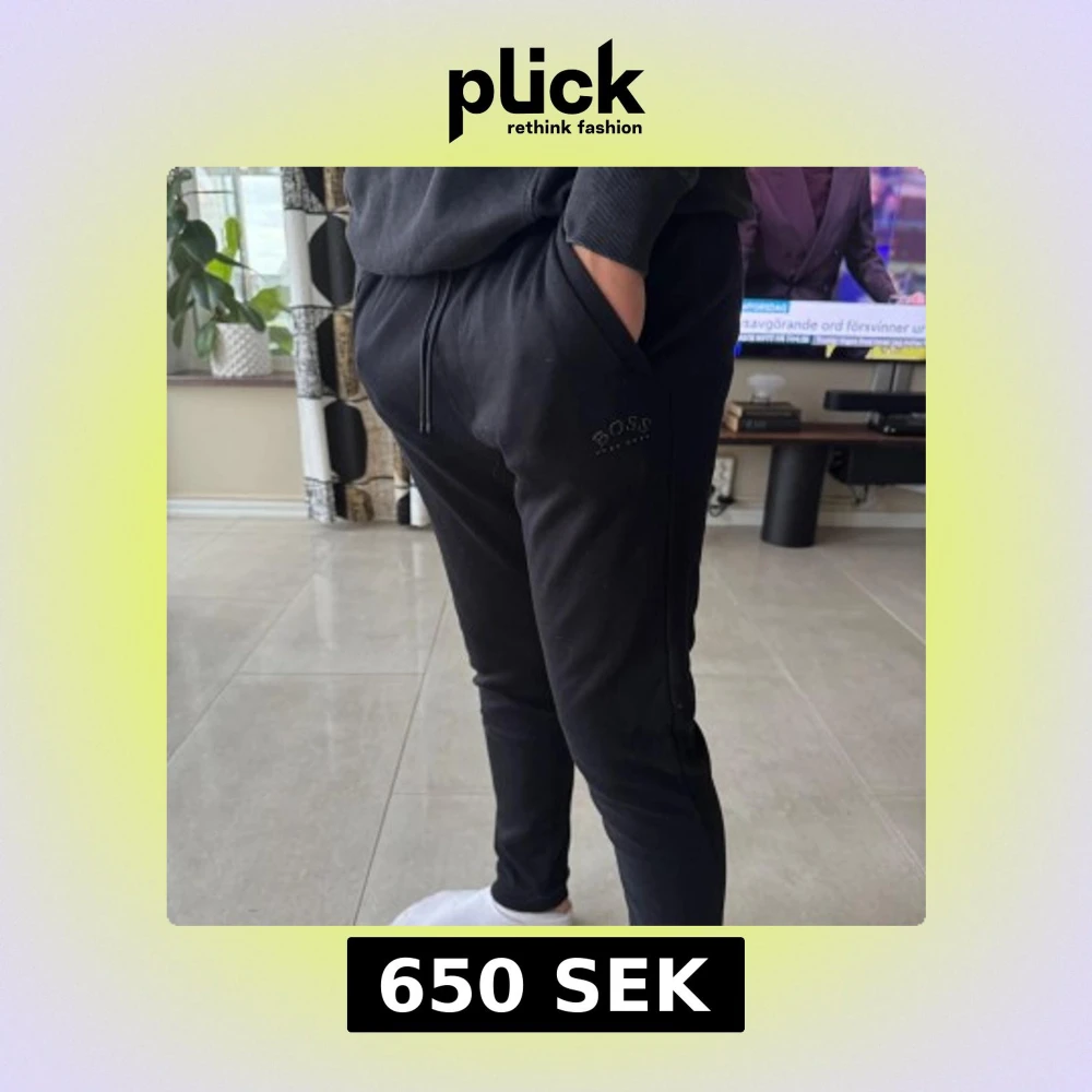 Svarta mjukisbyxor från BOSS med logga på vänster lår. Byxorna har en slim passform och är tillverkade i mjukt material, perfekt för en avslappnad stil. Riktigt sköna mjukisbrallor men komme ej till användning