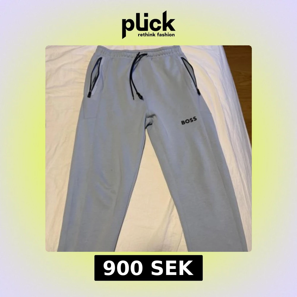 Snygga ljusblå mjukisbyxor från BOSS med svart logga på benet. Byxorna har elastisk midja med svart snörning och praktiska fickor med dragkedja. Perfekta för chill eller träning, mjukt material och relaxed passform.