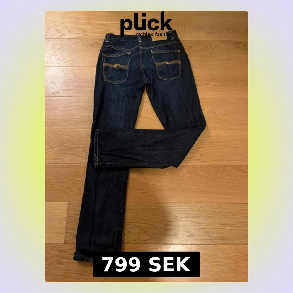 Säljer ett par mörkblå jeans från Nudie Jeans med klassisk orange söm och snygga detaljer på bakfickorna. Modellen har rak passform och normal midja, tillverkad i slitstarkt bomullsmaterial. Perfekt för dig som gillar stilrena och tidlösa jeans.
