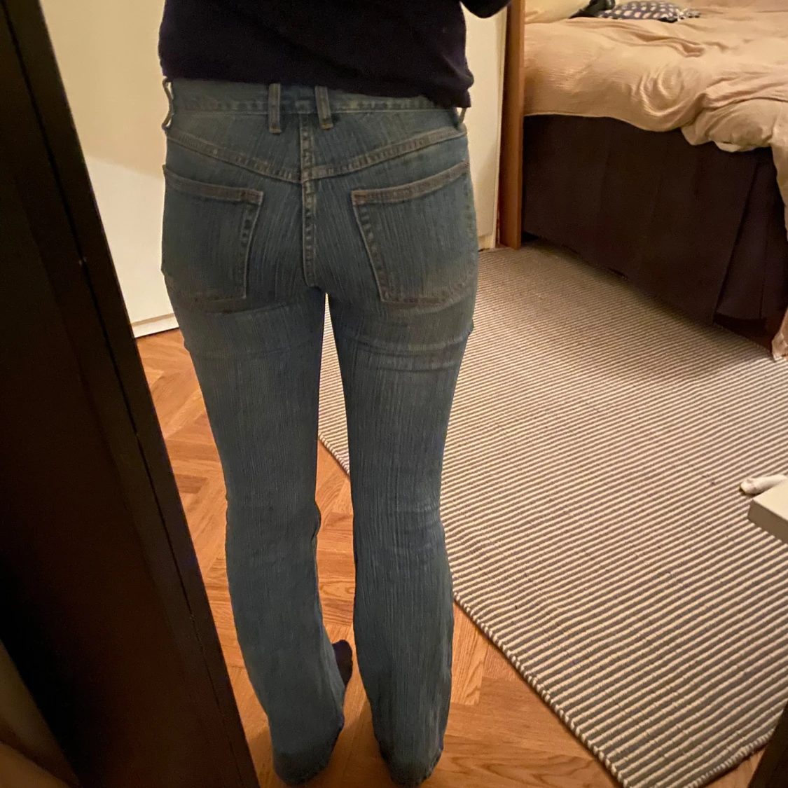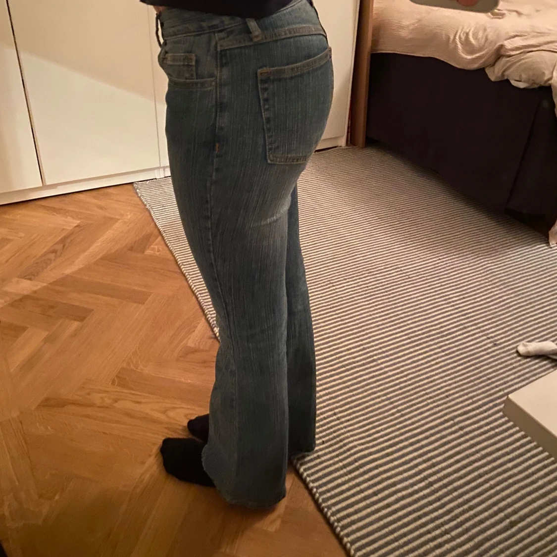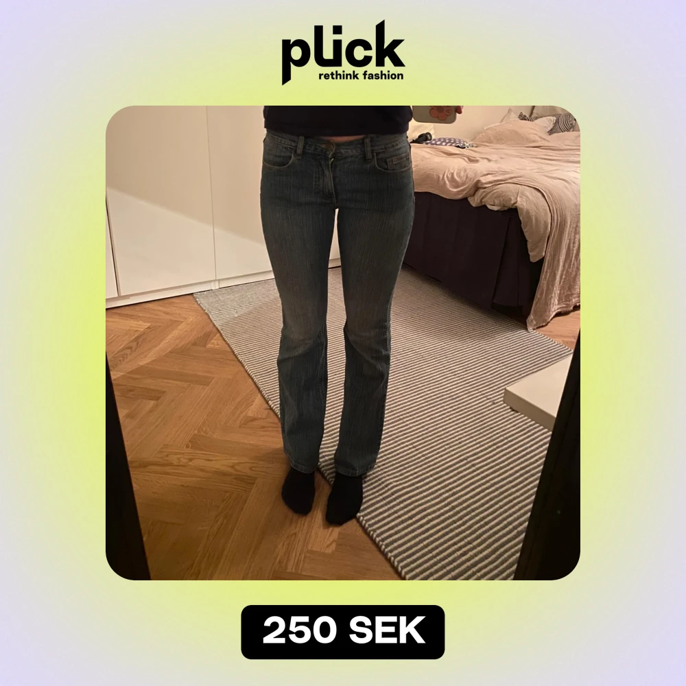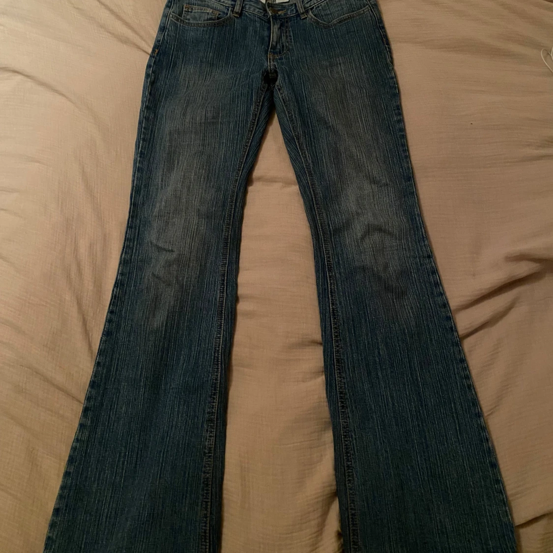 Säljer ett par snygga blå bootcut jeans i bra skick. De är lågmidjade och har en klassisk femficksdesign. Perfekta för både vardag och fest! Långa då jag är 180cm