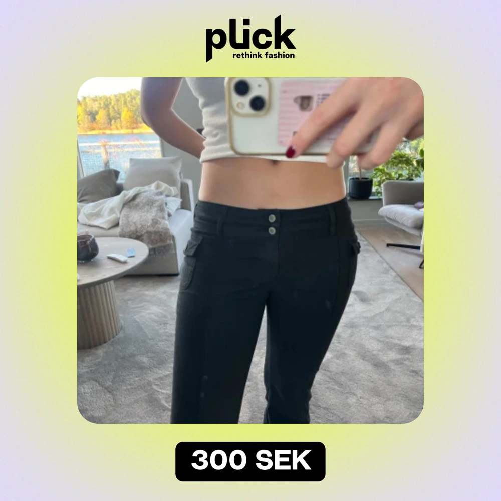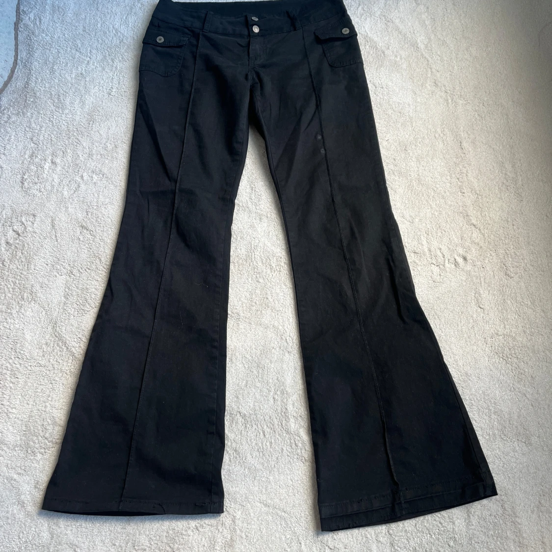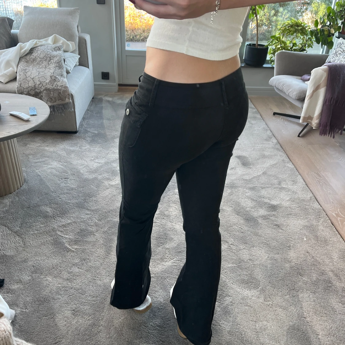Snyggaste svarta lågmidjade bootcut byxorna från Brandy Melville! Kom privat för mer info, fler bilder eller mått! Pris kan såklart diskuteras!🩷