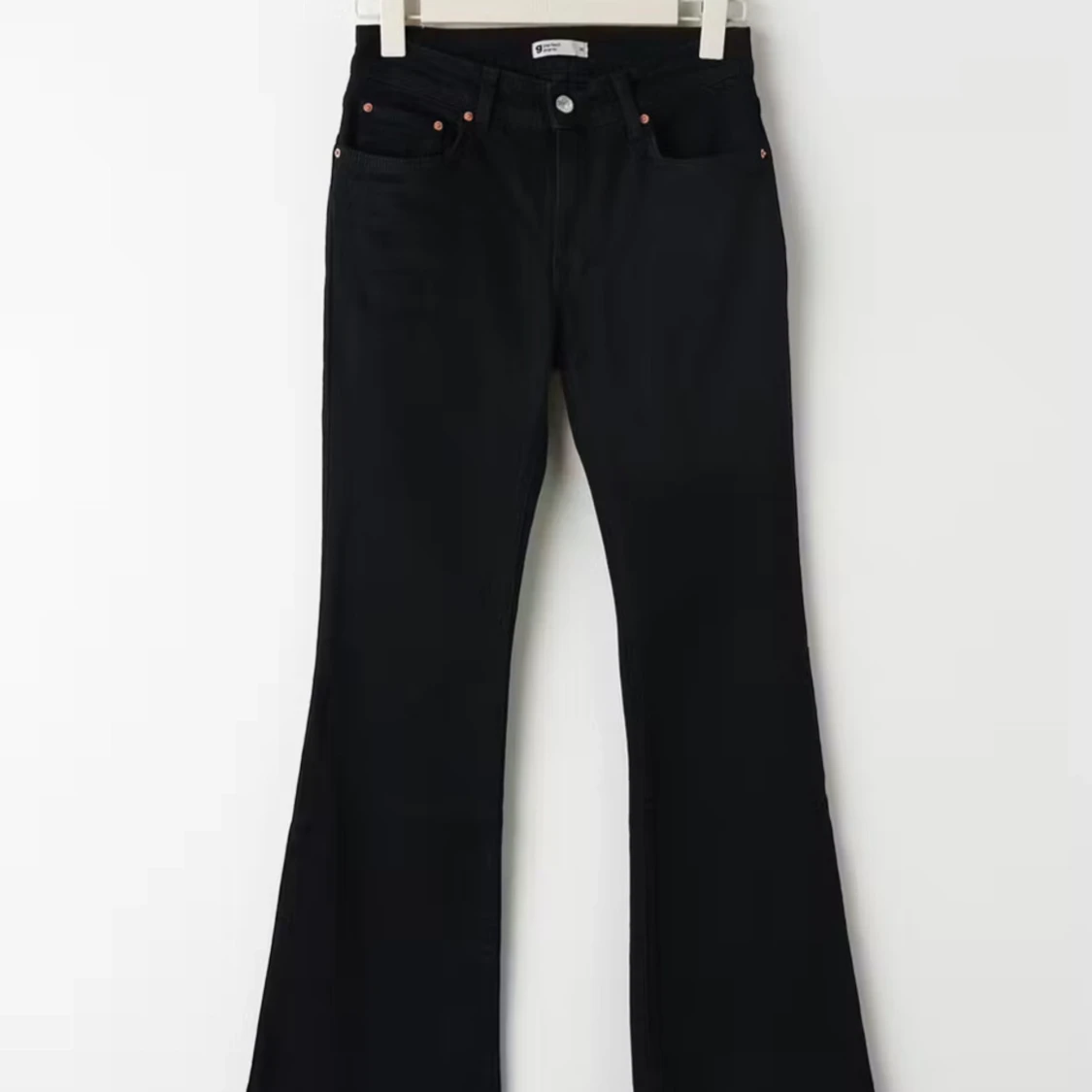Snygga svarta bootcut jeans med klassisk femficksdesign och knappgylf. Perfekta för en stilren look med en touch av retro. Passar bra till både sneakers och klackar. Har använt ett par gånger men är i väldigt bra skick.
