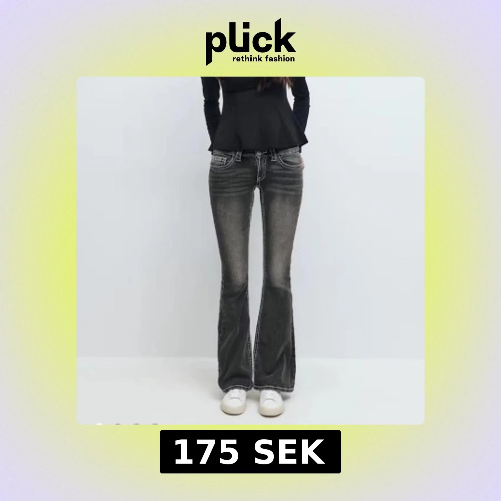 Säljer ett par nya, använt typ 2 gånger, svarta/mörk gråa bootcut jeans från Ginatricot. De är i young storlek 158 men passar mig bra som är 162. Jeansen har klassisk, låg midja och markerade bakfickor med dekorativa sömmar.