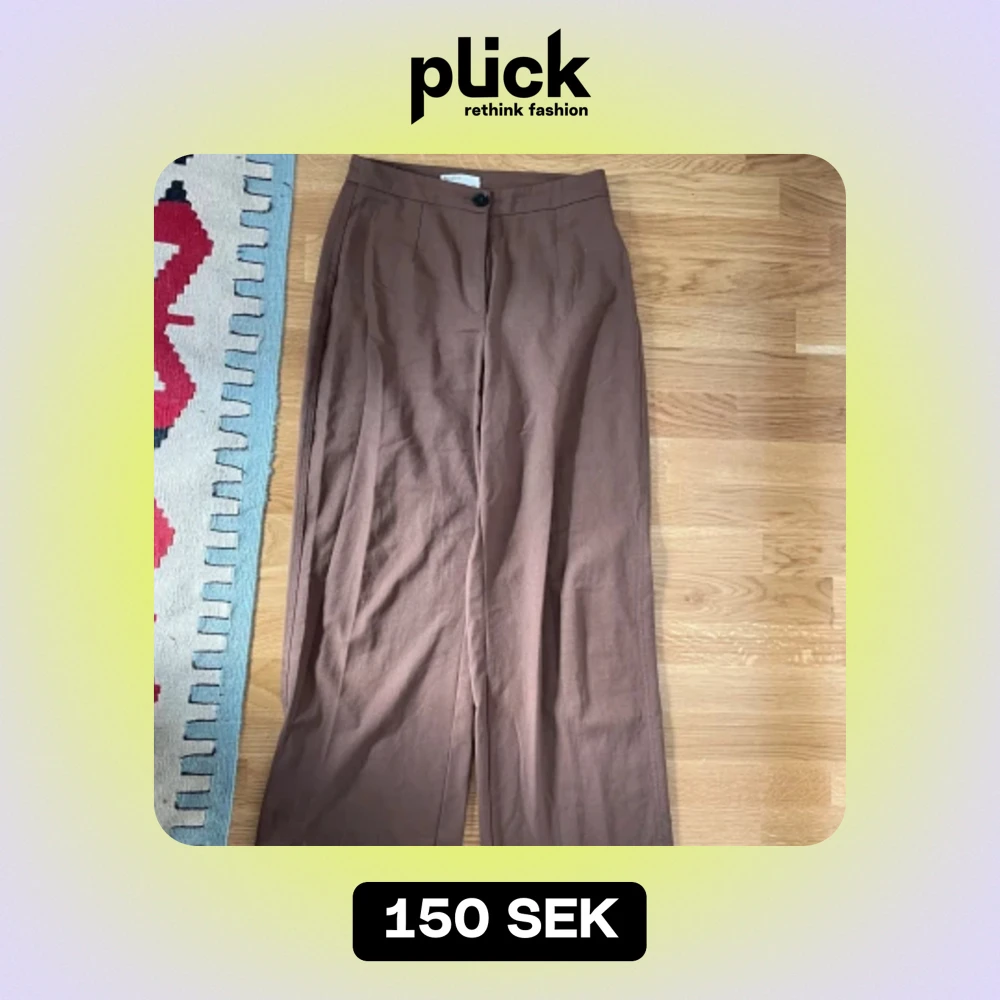 Bruna kostymbyxor i runt material från Bershka. Sitter väldigt snyggt och perfekt längd på mig som är 168cm. På mig faller de över skorna så att det blir flared/wide leg. Strl 38 men skulle säga passa 36 mer.