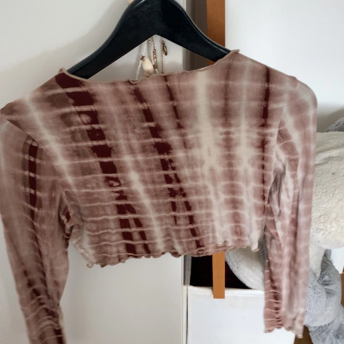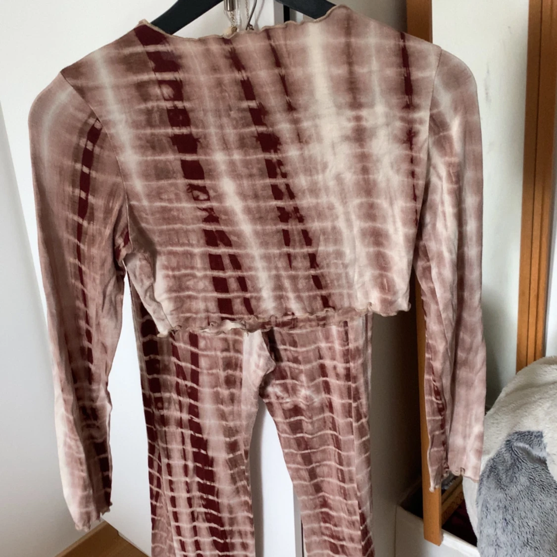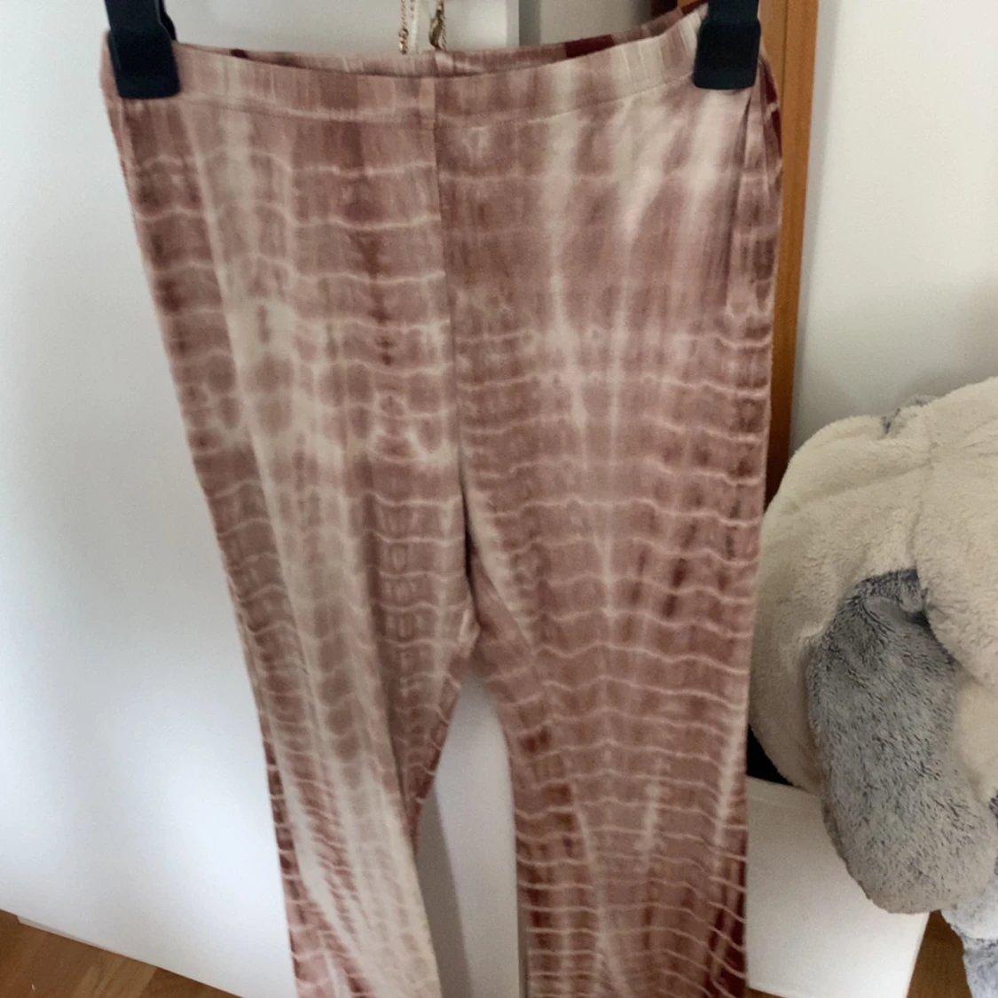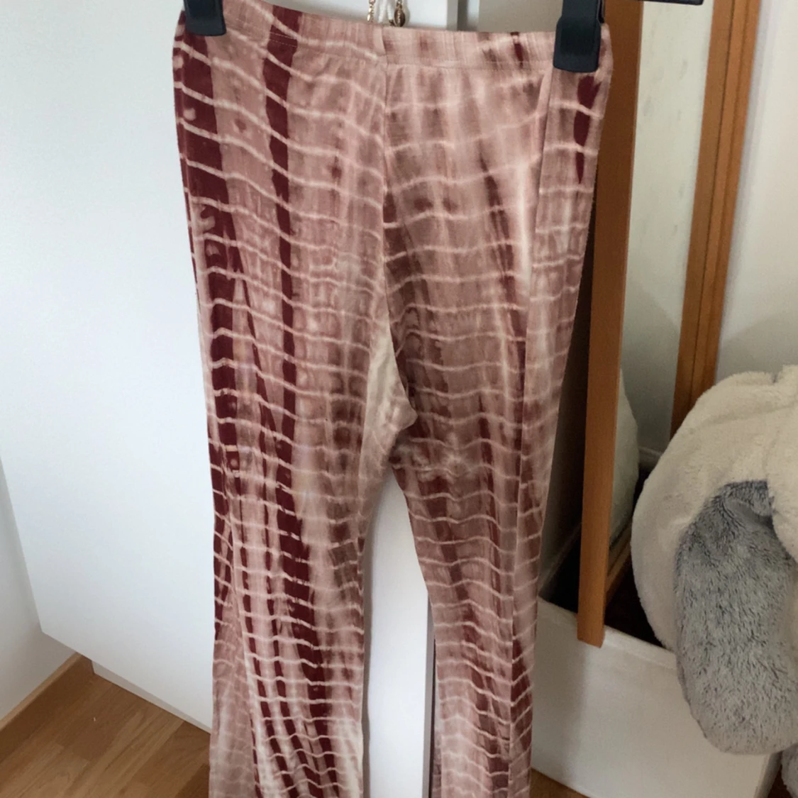 Säljer ett par stretchiga leggings med batikmönster i bruna och beige toner. Byxorna har en tight passform och är perfekta för dig som gillar en unik och trendig stil.