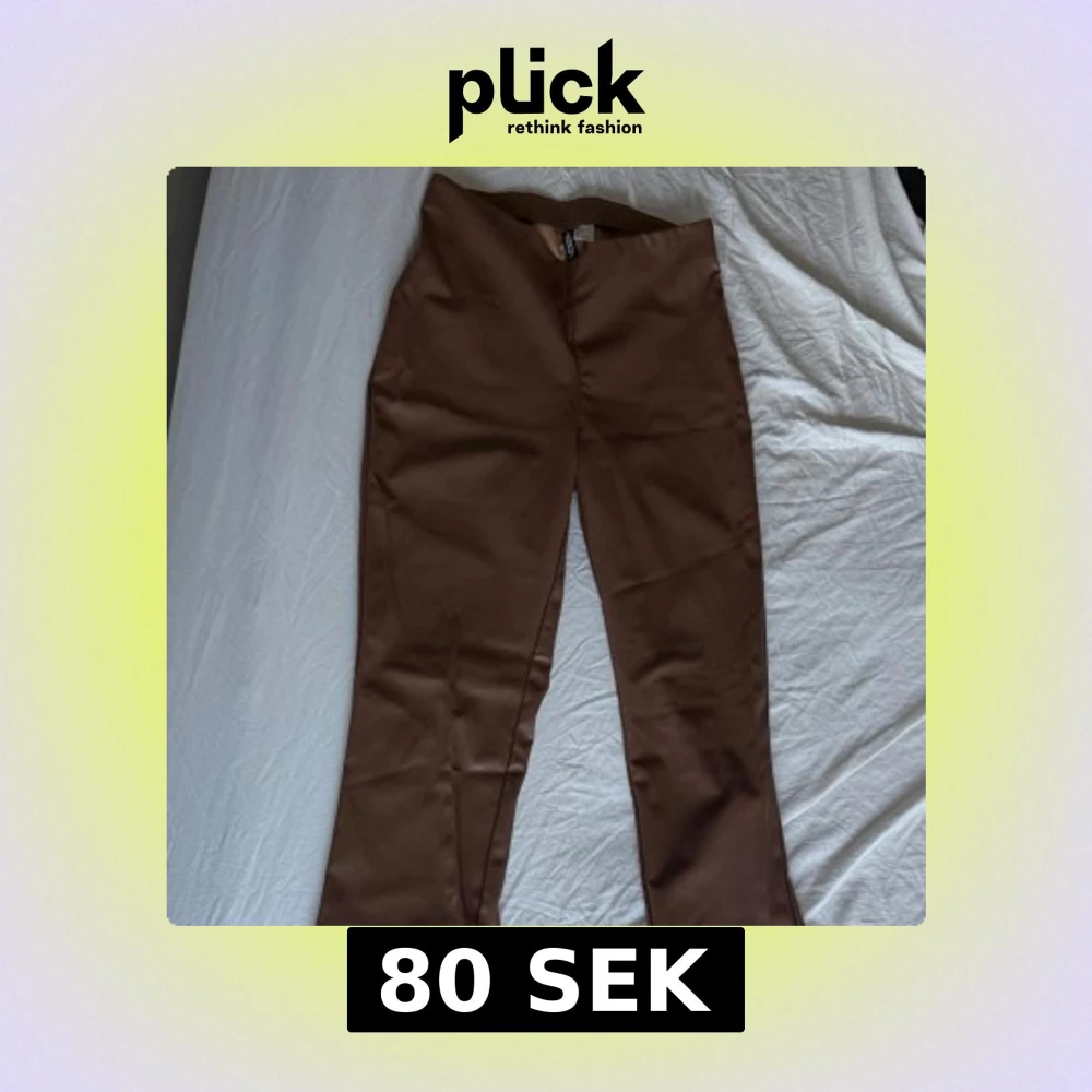 Snygga bruna byxor från H&M Divided i skinnimitation. Modellen är bootcut med medel midja. Perfekta för dig som vill ha en trendig och stilren look. Fodrade på insidan för extra komfort.
