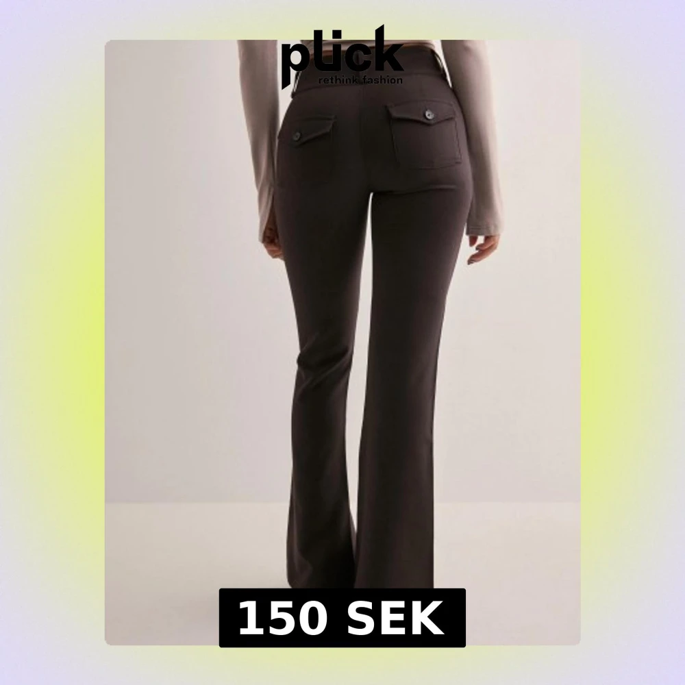 Snygga mörkbruna bootcut-byxor med hög midja och två knappar framtill. Baktill finns fickor med lock och knappdetaljer. Byxorna har en figurnära passform upptill och vida ben nedtill, vilket ger en riktigt trendig siluett.