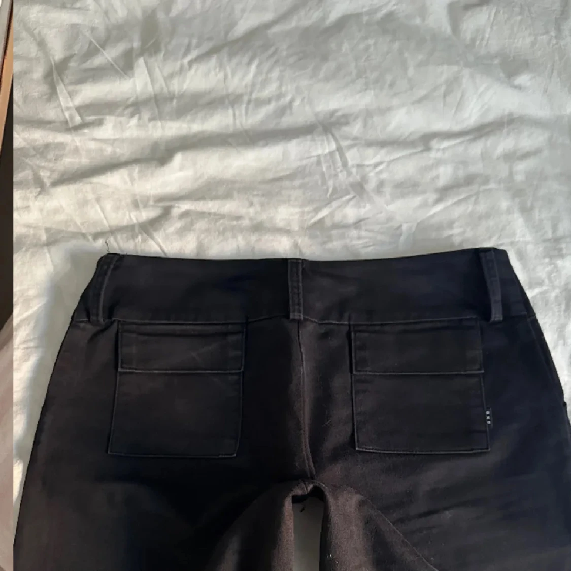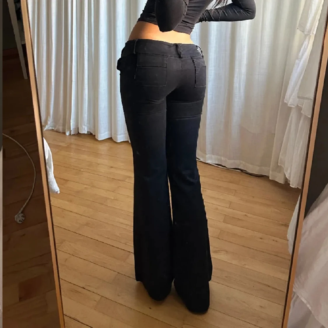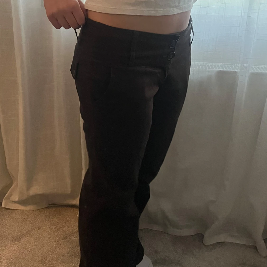 Snygga bruna bootcut kostymbyxor med låg midja. Perfekta för en trendig look med en tight passform upptill och utsvängda ben. Byxorna har knappar bak och är gjorda i ett mjukt material.
