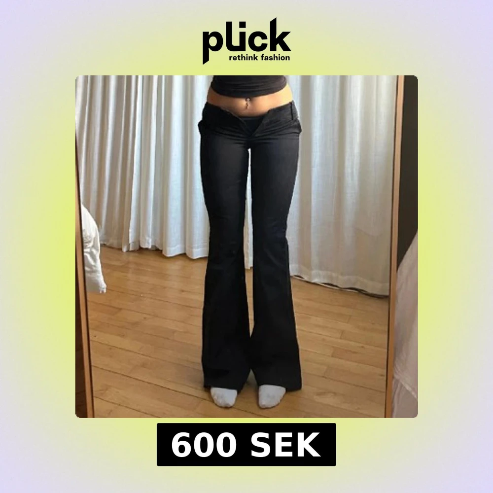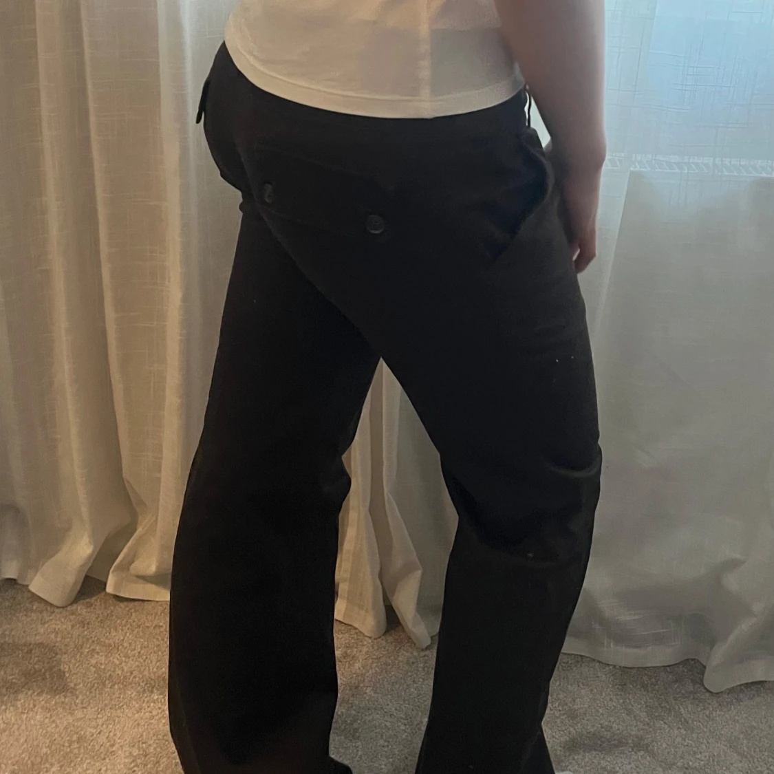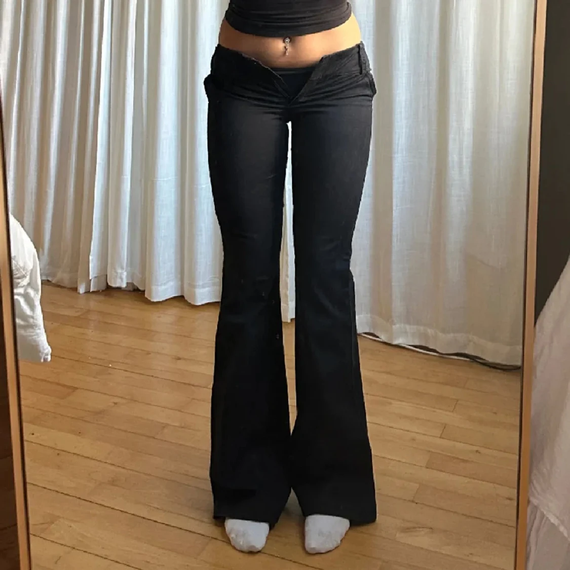 Snygga bruna bootcut kostymbyxor med låg midja. Perfekta för en trendig look med en tight passform upptill och utsvängda ben. Byxorna har knappar bak och är gjorda i ett mjukt material.