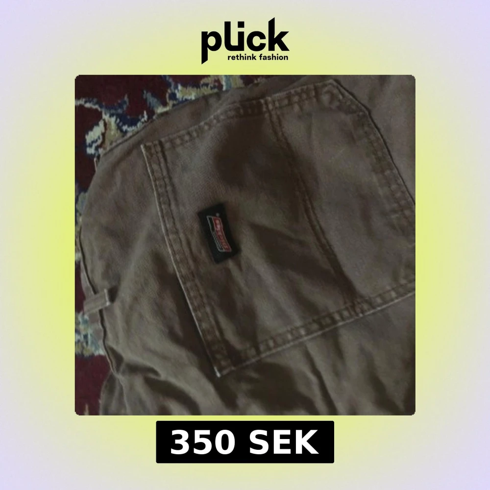 Säljer ett par bruna byxor från Dickies. De har en klassisk design med en stor ficka på sidan och är perfekta för en avslappnad stil. Byxorna är tillverkade i ett slitstarkt material och har en oversized passform