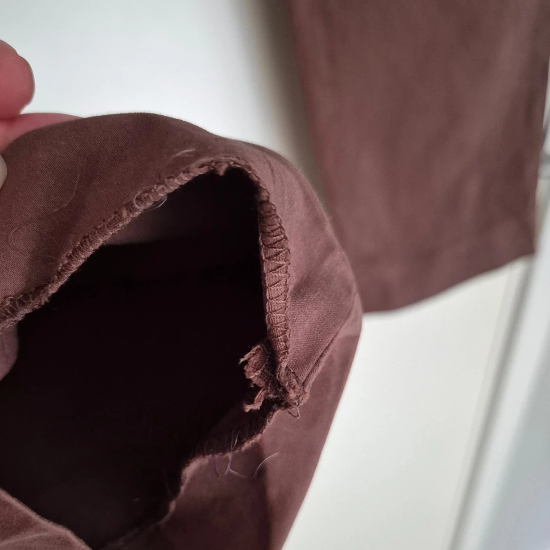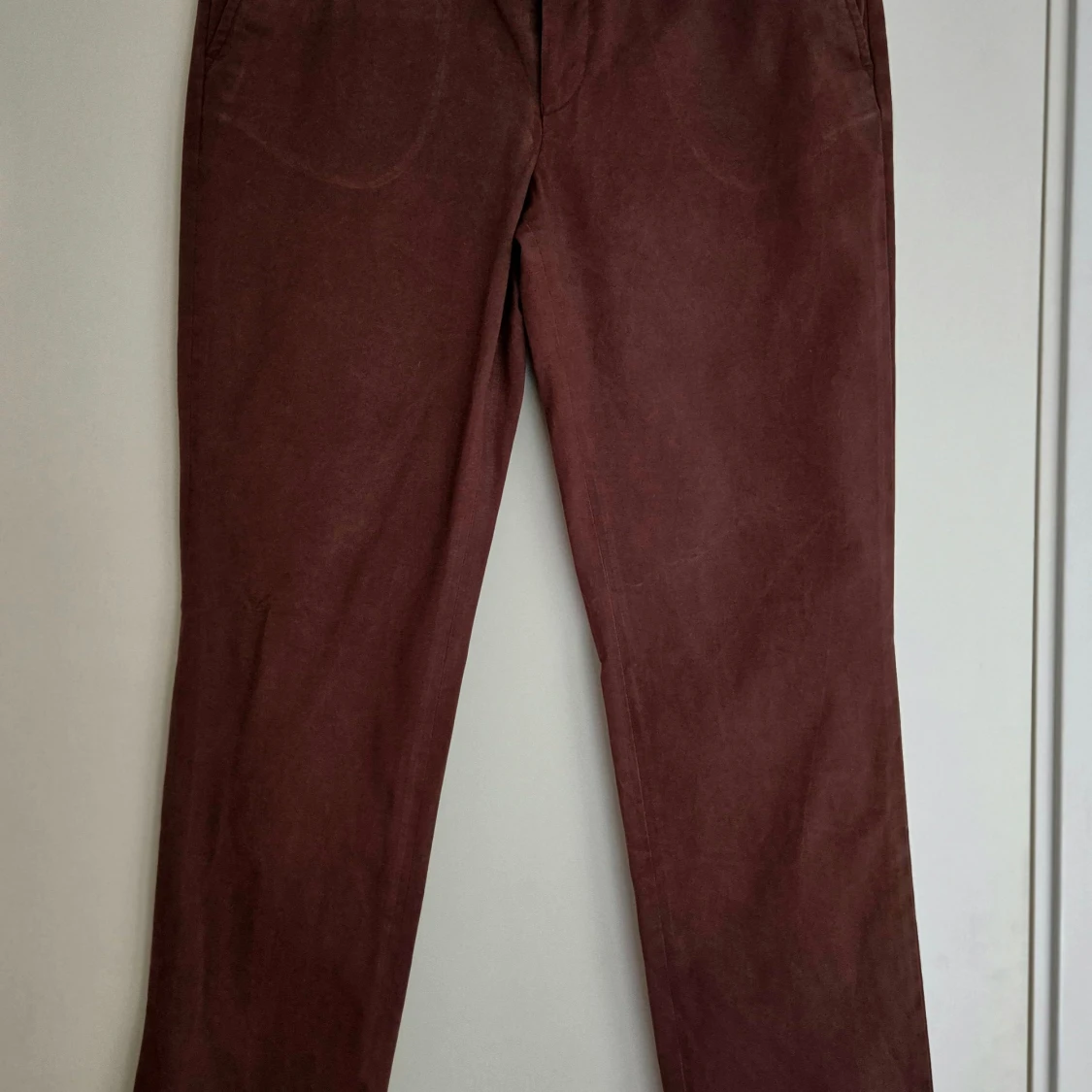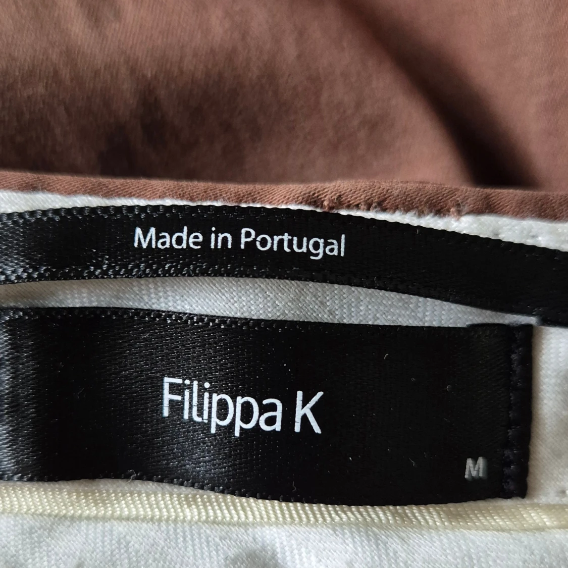 Bruna byxor från Filippa K i rak modell. Bomull, med klassisk passform och fickor framtill. Varm brun ton. Fållen har delvis gått upp på ena byxbenen.