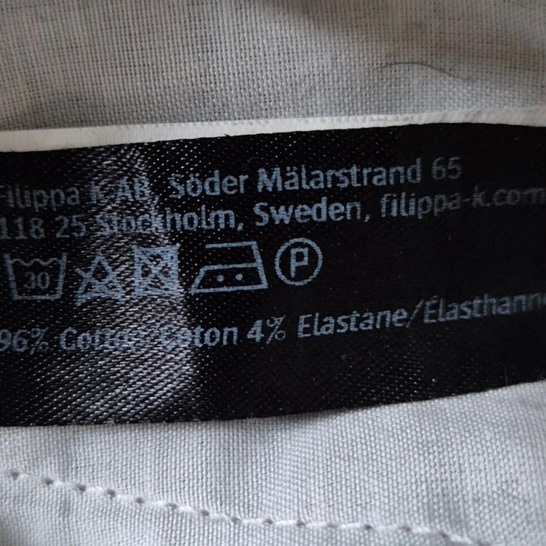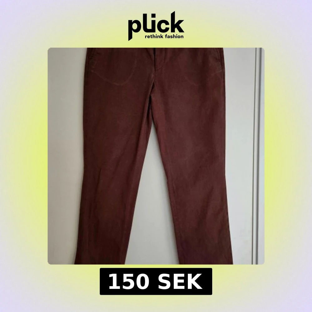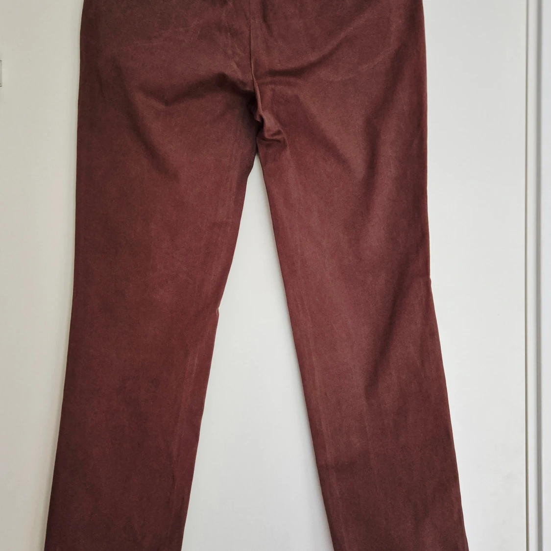 Bruna byxor från Filippa K i rak modell. Bomull, med klassisk passform och fickor framtill. Varm brun ton. Fållen har delvis gått upp på ena byxbenen.