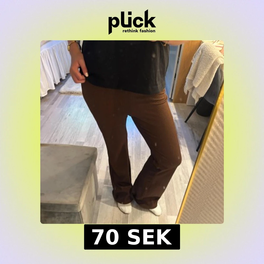 Säljer ett par bruna ribbade bootcut-byxor med glitter detaljer från Divided by H&M i storlek M. Byxorna har en skön stretchig passform och är tillverkade i polyesterblandning 🤩🤩