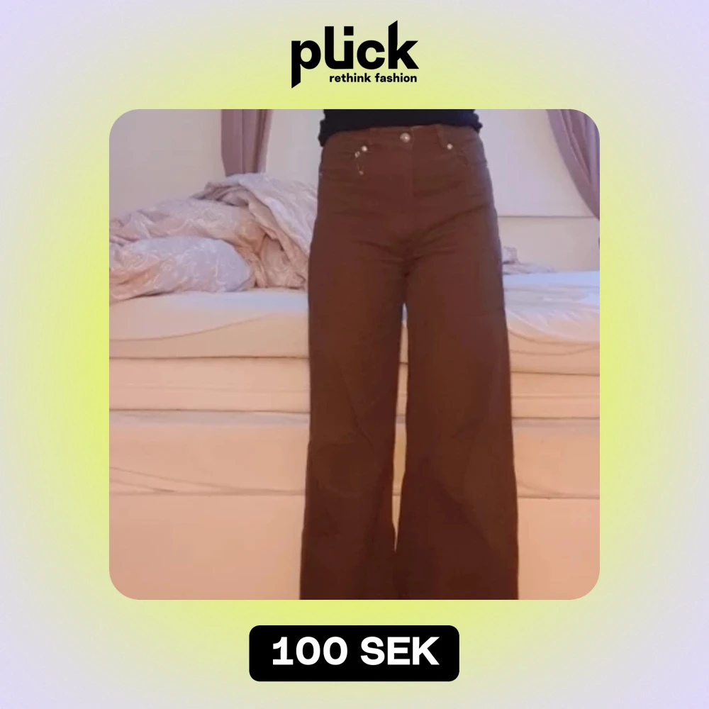 Ett par bruna jeans med hög midja och vida ben. Byxorna har en dragkedja och knappar framtill. Köpta på H&M 2021 och har ej använts sen dess. Säljer pga att jag har ej ngn användning för dem + dem är för stora. Säljer för 100 men går att pruta ner. DM för mer bilder