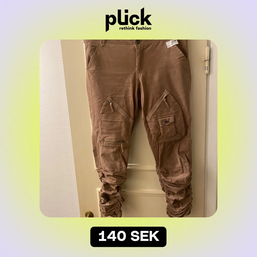 Säljer ett par bruna cargopants i bra skick. De har flera praktiska fickor med dragkedjor och knappar, perfekt för en casual look. Byxorna är loose fit och passar bra för höst och vår. Materialet känns slitstarkt och bekvämt. Benen veckade nedtill med gummiband.