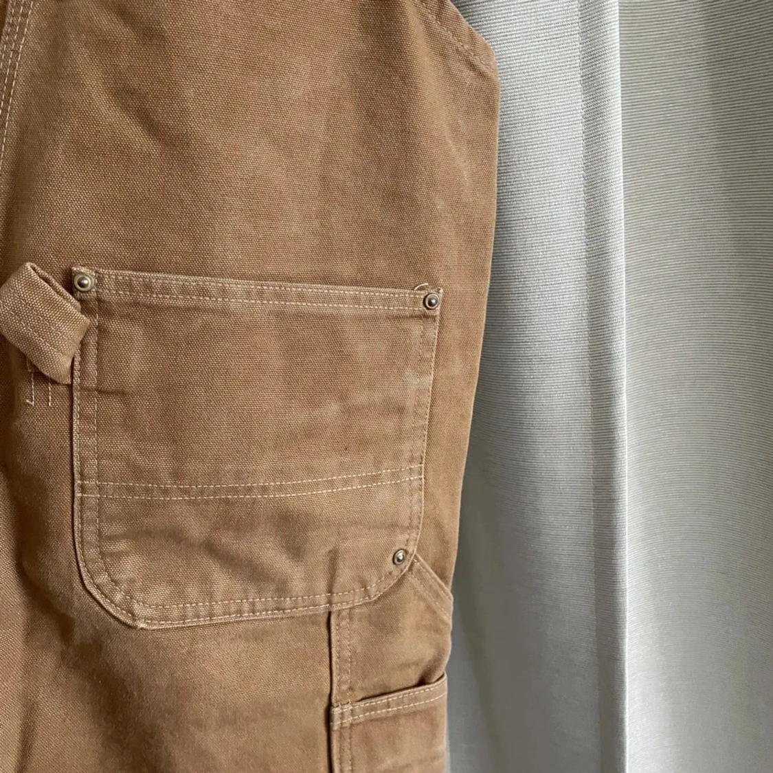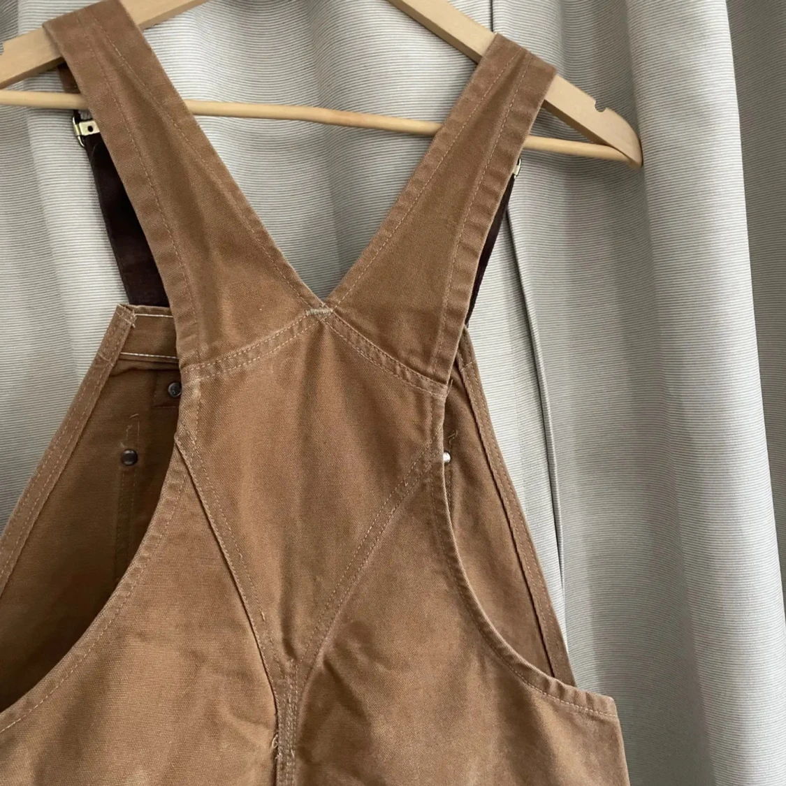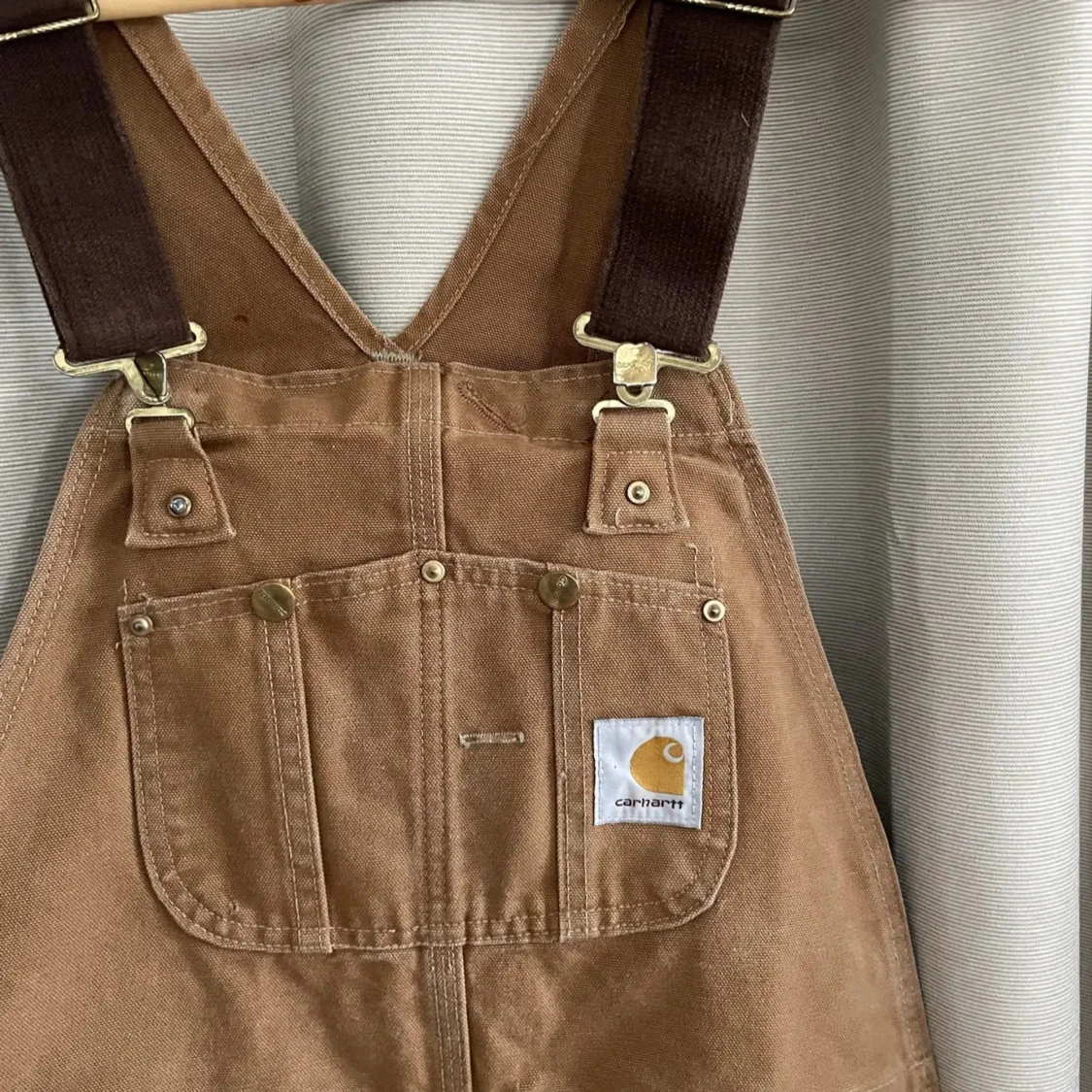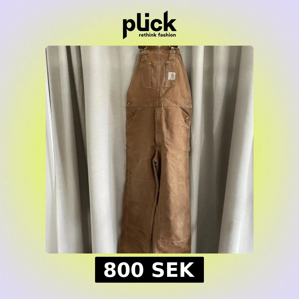 Säljer ett par klassiska bruna hängselbyxor från Carhartt med flera praktiska fickor och robusta detaljer. Byxorna har breda axelband, förstärkta knän och är tillverkade i slitstark bomullscanvas.