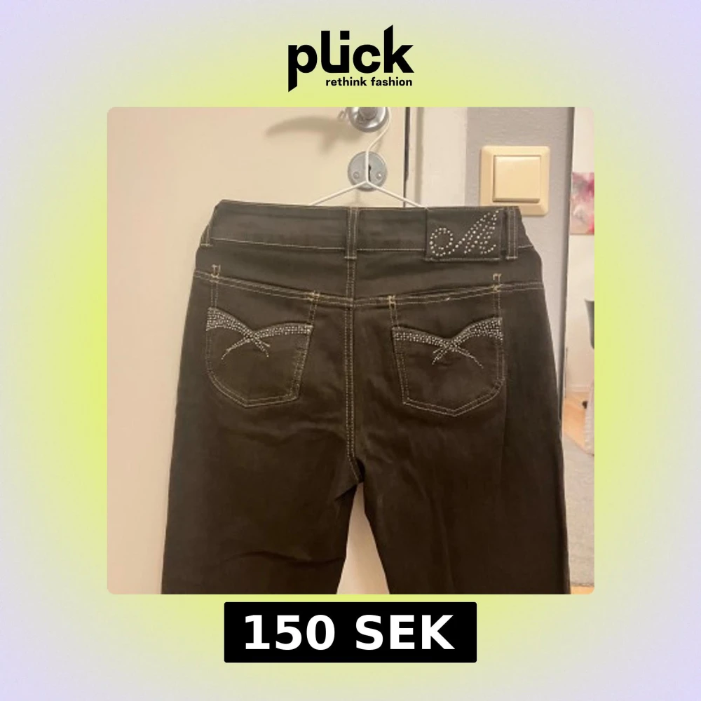 Mörkbruna jeans med rhinestones på bakfickorna! Är 164cm för referens